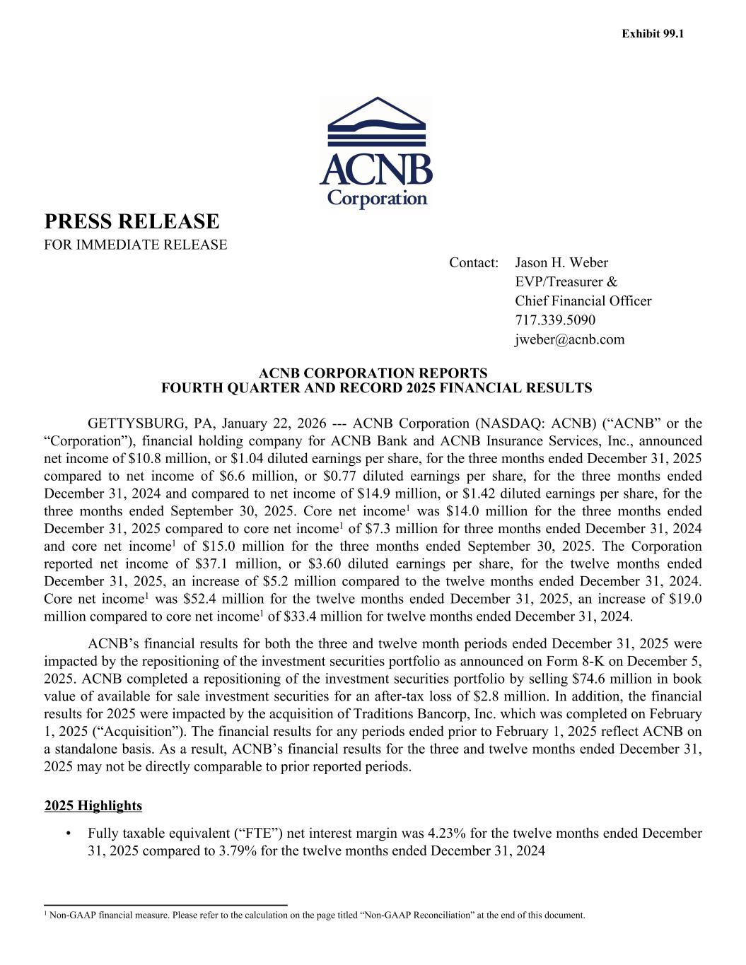 PRESS RELEASE FOR IMMEDIATE RELEASE Contact: Jason H. Weber EVP/Treasurer & Chief Financial Officer 717.339.5090 jweber@acnb.com ACNB CORPORATION REPORTS FOURTH QUARTER AND RECORD 2025 FINANCIAL RESULTS GETTYSBURG, PA, January 22, 2026 --- ACNB Corporation (NASDAQ: ACNB) (“ACNB” or the “Corporation”), financial holding company for ACNB Bank and ACNB Insurance Services, Inc., announced net income of $10.8 million, or $1.04 diluted earnings per share, for the three months ended December 31, 2025 compared to net income of $6.6 million, or $0.77 diluted earnings per share, for the three months ended December 31, 2024 and compared to net income of $14.9 million, or $1.42 diluted earnings per share, for the three months ended September 30, 2025. Core net income1 was $14.0 million for the three months ended December 31, 2025 compared to core net income1 of $7.3 million for three months ended December 31, 2024 and core net income1 of $15.0 million for the three months ended September 30, 2025. The Corporation reported net income of $37.1 million, or $3.60 diluted earnings per share, for the twelve months ended December 31, 2025, an increase of $5.2 million compared to the twelve months ended December 31, 2024. Core net income1 was $52.4 million for the twelve months ended December 31, 2025, an increase of $19.0 million compared to core net income1 of $33.4 million for twelve months ended December 31, 2024. ACNB’s financial results for both the three and twelve month periods ended December 31, 2025 were impacted by the repositioning of the investment securities portfolio as announced on Form 8-K on December 5, 2025. ACNB completed a repositioning of the investment securities portfolio by selling $74.6 million in book value of available for sale investment securities for an after-tax loss of $2.8 million. In addition, the financial results for 2025 were impacted by the acquisition of Traditions Bancorp, Inc. which was completed on February 1, 2025 (“Acquisition”). The financial results for any periods ended prior to February 1, 2025 reflect ACNB on a standalone basis. As a result, ACNB’s financial results for the three and twelve months ended December 31, 2025 may not be directly comparable to prior reported periods. 2025 Highlights • Fully taxable equivalent (“FTE”) net interest margin was 4.23% for the twelve months ended December 31, 2025 compared to 3.79% for the twelve months ended December 31, 2024 Exhibit 99.1 1 Non-GAAP financial measure. Please refer to the calculation on the page titled “Non-GAAP Reconciliation” at the end of this document.