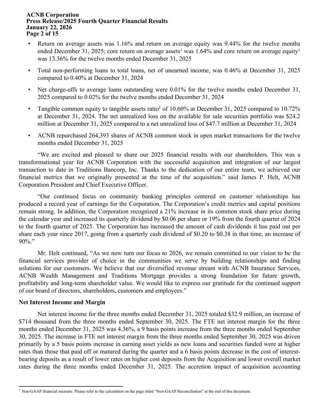 • Return on average assets was 1.16% and return on average equity was 9.44% for the twelve months ended December 31, 2025; core return on average assets1 was 1.64% and core return on average equity1 was 13.36% for the twelve months ended December 31, 2025 • Total non-performing loans to total loans, net of unearned income, was 0.46% at December 31, 2025 compared to 0.40% at December 31, 2024 • Net charge-offs to average loans outstanding were 0.01% for the twelve months ended December 31, 2025 compared to 0.02% for the twelve months ended December 31, 2024 • Tangible common equity to tangible assets ratio1 of 10.60% at December 31, 2025 compared to 10.72% at December 31, 2024. The net unrealized loss on the available for sale securities portfolio was $24.2 million at December 31, 2025 compared to a net unrealized loss of $47.7 million at December 31, 2024 • ACNB repurchased 264,393 shares of ACNB common stock in open market transactions for the twelve months ended December 31, 2025 “We are excited and pleased to share our 2025 financial results with our shareholders. This was a transformational year for ACNB Corporation with the successful acquisition and integration of our largest transaction to date in Traditions Bancorp, Inc. Thanks to the dedication of our entire team, we achieved our financial metrics that we originally presented at the time of the acquisition.” said James P. Helt, ACNB Corporation President and Chief Executive Officer. “Our continued focus on community banking principles centered on customer relationships has produced a record year of earnings for the Corporation. The Corporation’s credit metrics and capital positions remain strong. In addition, the Corporation recognized a 21% increase in its common stock share price during the calendar year and increased its quarterly dividend by $0.06 per share or 19% from the fourth quarter of 2024 to the fourth quarter of 2025. The Corporation has increased the amount of cash dividends it has paid out per share each year since 2017, going from a quarterly cash dividend of $0.20 to $0.38 in that time, an increase of 90%.” Mr. Helt continued, “As we now turn our focus to 2026, we remain committed to our vision to be the financial services provider of choice in the communities we serve by building relationships and finding solutions for our customers. We believe that our diversified revenue stream with ACNB Insurance Services, ACNB Wealth Management and Traditions Mortgage provides a strong foundation for future growth, profitability and long-term shareholder value. We would like to express our gratitude for the continued support of our board of directors, shareholders, customers and employees.” Net Interest Income and Margin Net interest income for the three months ended December 31, 2025 totaled $32.9 million, an increase of $714 thousand from the three months ended September 30, 2025. The FTE net interest margin for the three months ended December 31, 2025 was 4.36%, a 9 basis points increase from the three months ended September 30, 2025. The increase in FTE net interest margin from the three months ended September 30, 2025 was driven primarily by a 5 basis points increase in earning asset yields as new loans and securities funded were at higher rates than those that paid off or matured during the quarter and a 6 basis points decrease in the cost of interest- bearing deposits as a result of lower rates on higher cost deposits from the Acquisition and lower overall market rates during the three months ended December 31, 2025. The accretion impact of acquisition accounting ACNB Corporation Press Release/2025 Fourth Quarter Financial Results January 22, 2026 Page 2 of 15 1 Non-GAAP financial measure. Please refer to the calculation on the page titled “Non-GAAP Reconciliation” at the end of this document.