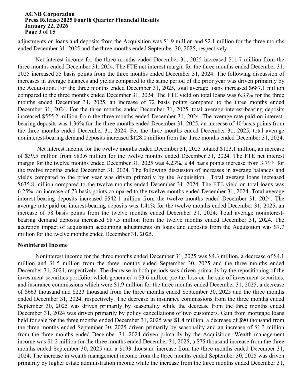 adjustments on loans and deposits from the Acquisition was $1.9 million and $2.1 million for the three months ended December 31, 2025 and the three months ended September 30, 2025, respectively. Net interest income for the three months ended December 31, 2025 increased $11.7 million from the three months ended December 31, 2024. The FTE net interest margin for the three months ended December 31, 2025 increased 55 basis points from the three months ended December 31, 2024. The following discussion of increases in average balances and yields compared to the same period of the prior year was driven primarily by the Acquisition. For the three months ended December 31, 2025, total average loans increased $687.1 million compared to the three months ended December 31, 2024. The FTE yield on total loans was 6.33% for the three months ended December 31, 2025, an increase of 72 basis points compared to the three months ended December 31, 2024. For the three months ended December 31, 2025, total average interest-bearing deposits increased $555.2 million from the three months ended December 31, 2024. The average rate paid on interest- bearing deposits was 1.36% for the three months ended December 31, 2025, an increase of 40 basis points from the three months ended December 31, 2024. For the three months ended December 31, 2025, total average noninterest-bearing demand deposits increased $128.0 million from the three months ended December 31, 2024. Net interest income for the twelve months ended December 31, 2025 totaled $123.1 million, an increase of $39.5 million from $83.6 million for the twelve months ended December 31, 2024. The FTE net interest margin for the twelve months ended December 31, 2025 was 4.23%, a 44 basis points increase from 3.79% for the twelve months ended December 31, 2024. The following discussion of increases in average balances and yields compared to the prior year was driven primarily by the Acquisition. Total average loans increased $635.8 million compared to the twelve months ended December 31, 2024. The FTE yield on total loans was 6.25%, an increase of 73 basis points compared to the twelve months ended December 31, 2024. Total average interest-bearing deposits increased $542.1 million from the twelve months ended December 31, 2024. The average rate paid on interest-bearing deposits was 1.41% for the twelve months ended December 31, 2025, an increase of 58 basis points from the twelve months ended December 31, 2024. Total average noninterest- bearing demand deposits increased $87.5 million from the twelve months ended December 31, 2024. The accretion impact of acquisition accounting adjustments on loans and deposits from the Acquisition was $7.7 million for the twelve months ended December 31, 2025. Noninterest Income Noninterest income for the three months ended December 31, 2025 was $4.3 million, a decrease of $4.1 million and $1.5 million from the three months ended September 30, 2025 and the three months ended December 31, 2024, respectively. The decrease in both periods was driven primarily by the repositioning of the investment securities portfolio, which generated a $3.6 million pre-tax loss on the sale of investment securities, and insurance commissions which were $1.9 million for the three months ended December 31, 2025, a decrease of $663 thousand and $223 thousand from the three months ended September 30, 2025 and the three months ended December 31, 2024, respectively. The decrease in insurance commissions from the three months ended September 30, 2025 was driven primarily by seasonality while the decrease from the three months ended December 31, 2024 was driven primarily by policy cancellations of two customers. Gain from mortgage loans held for sale for the three months ended December 31, 2025 was $1.4 million, a decrease of $90 thousand from the three months ended September 30, 2025 driven primarily by seasonality and an increase of $1.3 million from the three months ended December 31, 2024 driven primarily by the Acquisition. Wealth management income was $1.2 million for the three months ended December 31, 2025, a $75 thousand increase from the three months ended September 30, 2025 and a $193 thousand increase from the three months ended December 31, 2024. The increase in wealth management income from the three months ended September 30, 2025 was driven primarily by higher estate administration income while the increase from the three months ended December 31, ACNB Corporation Press Release/2025 Fourth Quarter Financial Results January 22, 2026 Page 3 of 15