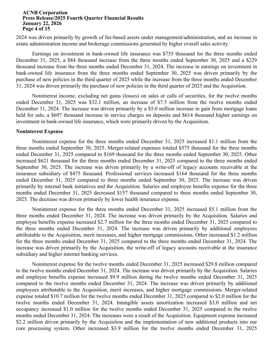 2024 was driven primarily by growth of fee-based assets under management/administration, and an increase in estate administration income and brokerage commissions generated by higher overall sales activity. Earnings on investment in bank-owned life insurance was $735 thousand for the three months ended December 31, 2025, a $84 thousand increase from the three months ended September 30, 2025 and a $229 thousand increase from the three months ended December 31, 2024. The increase in earnings on investment in bank-owned life insurance from the three months ended September 30, 2025 was driven primarily by the purchase of new policies in the third quarter of 2025 while the increase from the three months ended December 31, 2024 was driven primarily the purchase of new policies in the third quarter of 2025 and the Acquisition. Noninterest income, excluding net gains (losses) on sales or calls of securities, for the twelve months ended December 31, 2025 was $32.1 million, an increase of $7.5 million from the twelve months ended December 31, 2024. The increase was driven primarily by a $5.0 million increase in gain from mortgage loans held for sale, a $697 thousand increase in service charges on deposits and $614 thousand higher earnings on investment in bank-owned life insurance, which were primarily driven by the Acquisition. Noninterest Expense Noninterest expense for the three months ended December 31, 2025 increased $1.1 million from the three months ended September 30, 2025. Merger-related expenses totaled $575 thousand for the three months ended December 31, 2025 compared to $169 thousand for the three months ended September 30, 2025. Other increased $621 thousand for the three months ended December 31, 2025 compared to the three months ended September 30, 2025. The increase was driven primarily by a write-off of legacy accounts receivable at the insurance subsidiary of $475 thousand. Professional services increased $164 thousand for the three months ended December 31, 2025 compared to three months ended September 30, 2025. The increase was driven primarily by internal bank initiatives and the Acquisition. Salaries and employee benefits expense for the three months ended December 31, 2025 decreased $157 thousand compared to three months ended September 30, 2025. The decrease was driven primarily by lower health insurance expense. Noninterest expense for the three months ended December 31, 2025 increased $5.1 million from the three months ended December 31, 2024. The increase was driven primarily by the Acquisition. Salaries and employee benefits expense increased $2.7 million for the three months ended December 31, 2025 compared to the three months ended December 31, 2024. The increase was driven primarily by additional employees attributable to the Acquisition, merit increases, and higher mortgage commissions. Other increased $1.2 million for the three months ended December 31, 2025 compared to the three months ended December 31, 2024. The increase was driven primarily by the Acquisition, the write-off of legacy accounts receivable at the insurance subsidiary and higher internet banking services. Noninterest expense for the twelve months ended December 31, 2025 increased $29.8 million compared to the twelve months ended December 31, 2024. The increase was driven primarily by the Acquisition. Salaries and employee benefits expense increased $9.9 million during the twelve months ended December 31, 2025 compared to the twelve months ended December 31, 2024. The increase was driven primarily by additional employees attributable to the Acquisition, merit increases, and higher mortgage commissions. Merger-related expense totaled $10.7 million for the twelve months ended December 31, 2025 compared to $2.0 million for the twelve months ended December 31, 2024. Intangible assets amortization increased $3.0 million and net occupancy increased $1.0 million for the twelve months ended December 31, 2025 compared to the twelve months ended December 31, 2024. The increases were a result of the Acquisition. Equipment expense increased $2.2 million driven primarily by the Acquisition and the implementation of new additional products into our core processing system. Other increased $3.9 million for the twelve months ended December 31, 2025 ACNB Corporation Press Release/2025 Fourth Quarter Financial Results January 22, 2026 Page 4 of 15
