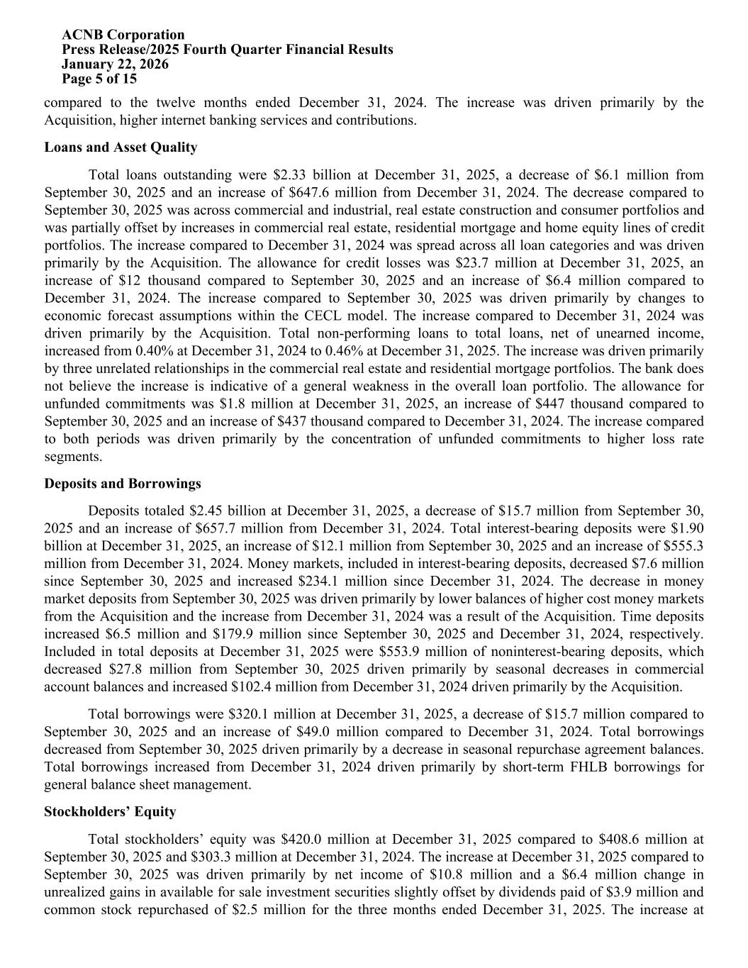 compared to the twelve months ended December 31, 2024. The increase was driven primarily by the Acquisition, higher internet banking services and contributions. Loans and Asset Quality Total loans outstanding were $2.33 billion at December 31, 2025, a decrease of $6.1 million from September 30, 2025 and an increase of $647.6 million from December 31, 2024. The decrease compared to September 30, 2025 was across commercial and industrial, real estate construction and consumer portfolios and was partially offset by increases in commercial real estate, residential mortgage and home equity lines of credit portfolios. The increase compared to December 31, 2024 was spread across all loan categories and was driven primarily by the Acquisition. The allowance for credit losses was $23.7 million at December 31, 2025, an increase of $12 thousand compared to September 30, 2025 and an increase of $6.4 million compared to December 31, 2024. The increase compared to September 30, 2025 was driven primarily by changes to economic forecast assumptions within the CECL model. The increase compared to December 31, 2024 was driven primarily by the Acquisition. Total non-performing loans to total loans, net of unearned income, increased from 0.40% at December 31, 2024 to 0.46% at December 31, 2025. The increase was driven primarily by three unrelated relationships in the commercial real estate and residential mortgage portfolios. The bank does not believe the increase is indicative of a general weakness in the overall loan portfolio. The allowance for unfunded commitments was $1.8 million at December 31, 2025, an increase of $447 thousand compared to September 30, 2025 and an increase of $437 thousand compared to December 31, 2024. The increase compared to both periods was driven primarily by the concentration of unfunded commitments to higher loss rate segments. Deposits and Borrowings Deposits totaled $2.45 billion at December 31, 2025, a decrease of $15.7 million from September 30, 2025 and an increase of $657.7 million from December 31, 2024. Total interest-bearing deposits were $1.90 billion at December 31, 2025, an increase of $12.1 million from September 30, 2025 and an increase of $555.3 million from December 31, 2024. Money markets, included in interest-bearing deposits, decreased $7.6 million since September 30, 2025 and increased $234.1 million since December 31, 2024. The decrease in money market deposits from September 30, 2025 was driven primarily by lower balances of higher cost money markets from the Acquisition and the increase from December 31, 2024 was a result of the Acquisition. Time deposits increased $6.5 million and $179.9 million since September 30, 2025 and December 31, 2024, respectively. Included in total deposits at December 31, 2025 were $553.9 million of noninterest-bearing deposits, which decreased $27.8 million from September 30, 2025 driven primarily by seasonal decreases in commercial account balances and increased $102.4 million from December 31, 2024 driven primarily by the Acquisition. Total borrowings were $320.1 million at December 31, 2025, a decrease of $15.7 million compared to September 30, 2025 and an increase of $49.0 million compared to December 31, 2024. Total borrowings decreased from September 30, 2025 driven primarily by a decrease in seasonal repurchase agreement balances. Total borrowings increased from December 31, 2024 driven primarily by short-term FHLB borrowings for general balance sheet management. Stockholders’ Equity Total stockholders’ equity was $420.0 million at December 31, 2025 compared to $408.6 million at September 30, 2025 and $303.3 million at December 31, 2024. The increase at December 31, 2025 compared to September 30, 2025 was driven primarily by net income of $10.8 million and a $6.4 million change in unrealized gains in available for sale investment securities slightly offset by dividends paid of $3.9 million and common stock repurchased of $2.5 million for the three months ended December 31, 2025. The increase at ACNB Corporation Press Release/2025 Fourth Quarter Financial Results January 22, 2026 Page 5 of 15