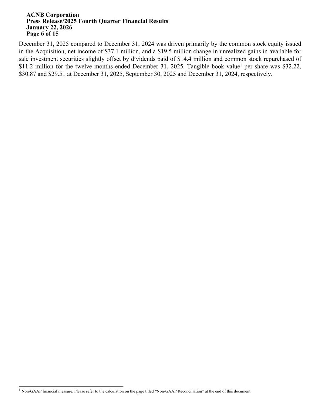 December 31, 2025 compared to December 31, 2024 was driven primarily by the common stock equity issued in the Acquisition, net income of $37.1 million, and a $19.5 million change in unrealized gains in available for sale investment securities slightly offset by dividends paid of $14.4 million and common stock repurchased of $11.2 million for the twelve months ended December 31, 2025. Tangible book value1 per share was $32.22, $30.87 and $29.51 at December 31, 2025, September 30, 2025 and December 31, 2024, respectively. ACNB Corporation Press Release/2025 Fourth Quarter Financial Results January 22, 2026 Page 6 of 15 1 Non-GAAP financial measure. Please refer to the calculation on the page titled “Non-GAAP Reconciliation” at the end of this document.