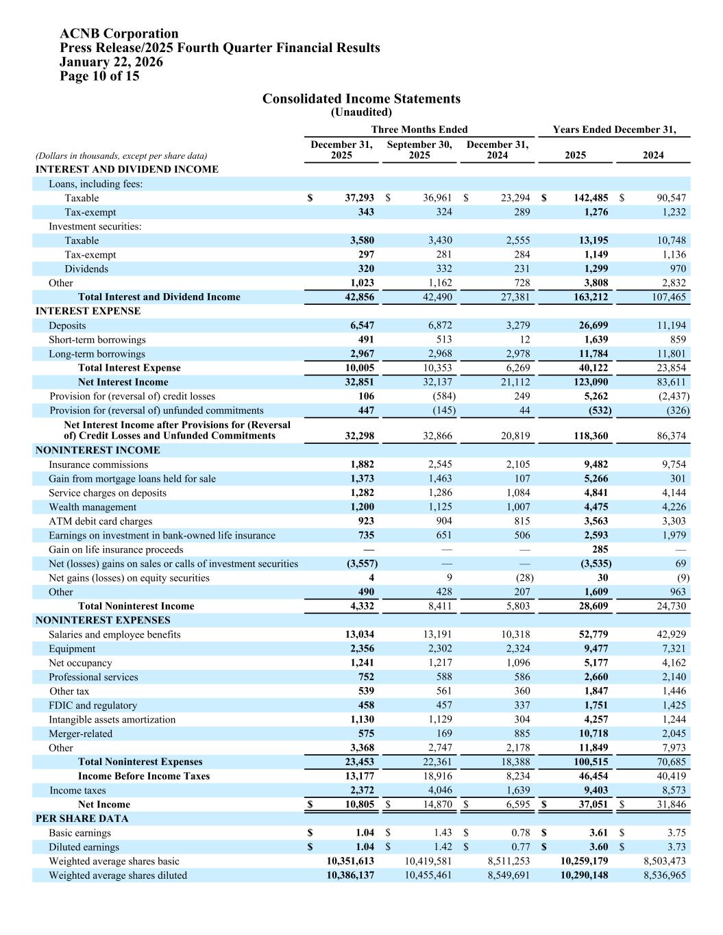 Consolidated Income Statements (Unaudited) Three Months Ended Years Ended December 31, (Dollars in thousands, except per share data) December 31, 2025 September 30, 2025 December 31, 2024 2025 2024 INTEREST AND DIVIDEND INCOME Loans, including fees: Taxable $ 37,293 $ 36,961 $ 23,294 $ 142,485 $ 90,547 Tax-exempt 343 324 289 1,276 1,232 Investment securities: Taxable 3,580 3,430 2,555 13,195 10,748 Tax-exempt 297 281 284 1,149 1,136 Dividends 320 332 231 1,299 970 Other 1,023 1,162 728 3,808 2,832 Total Interest and Dividend Income 42,856 42,490 27,381 163,212 107,465 INTEREST EXPENSE Deposits 6,547 6,872 3,279 26,699 11,194 Short-term borrowings 491 513 12 1,639 859 Long-term borrowings 2,967 2,968 2,978 11,784 11,801 Total Interest Expense 10,005 10,353 6,269 40,122 23,854 Net Interest Income 32,851 32,137 21,112 123,090 83,611 Provision for (reversal of) credit losses 106 (584) 249 5,262 (2,437) Provision for (reversal of) unfunded commitments 447 (145) 44 (532) (326) Net Interest Income after Provisions for (Reversal of) Credit Losses and Unfunded Commitments 32,298 32,866 20,819 118,360 86,374 NONINTEREST INCOME Insurance commissions 1,882 2,545 2,105 9,482 9,754 Gain from mortgage loans held for sale 1,373 1,463 107 5,266 301 Service charges on deposits 1,282 1,286 1,084 4,841 4,144 Wealth management 1,200 1,125 1,007 4,475 4,226 ATM debit card charges 923 904 815 3,563 3,303 Earnings on investment in bank-owned life insurance 735 651 506 2,593 1,979 Gain on life insurance proceeds — — — 285 — Net (losses) gains on sales or calls of investment securities (3,557) — — (3,535) 69 Net gains (losses) on equity securities 4 9 (28) 30 (9) Other 490 428 207 1,609 963 Total Noninterest Income 4,332 8,411 5,803 28,609 24,730 NONINTEREST EXPENSES Salaries and employee benefits 13,034 13,191 10,318 52,779 42,929 Equipment 2,356 2,302 2,324 9,477 7,321 Net occupancy 1,241 1,217 1,096 5,177 4,162 Professional services 752 588 586 2,660 2,140 Other tax 539 561 360 1,847 1,446 FDIC and regulatory 458 457 337 1,751 1,425 Intangible assets amortization 1,130 1,129 304 4,257 1,244 Merger-related 575 169 885 10,718 2,045 Other 3,368 2,747 2,178 11,849 7,973 Total Noninterest Expenses 23,453 22,361 18,388 100,515 70,685 Income Before Income Taxes 13,177 18,916 8,234 46,454 40,419 Income taxes 2,372 4,046 1,639 9,403 8,573 Net Income $ 10,805 $ 14,870 $ 6,595 $ 37,051 $ 31,846 PER SHARE DATA Basic earnings $ 1.04 $ 1.43 $ 0.78 $ 3.61 $ 3.75 Diluted earnings $ 1.04 $ 1.42 $ 0.77 $ 3.60 $ 3.73 Weighted average shares basic 10,351,613 10,419,581 8,511,253 10,259,179 8,503,473 Weighted average shares diluted 10,386,137 10,455,461 8,549,691 10,290,148 8,536,965 ACNB Corporation Press Release/2025 Fourth Quarter Financial Results January 22, 2026 Page 10 of 15