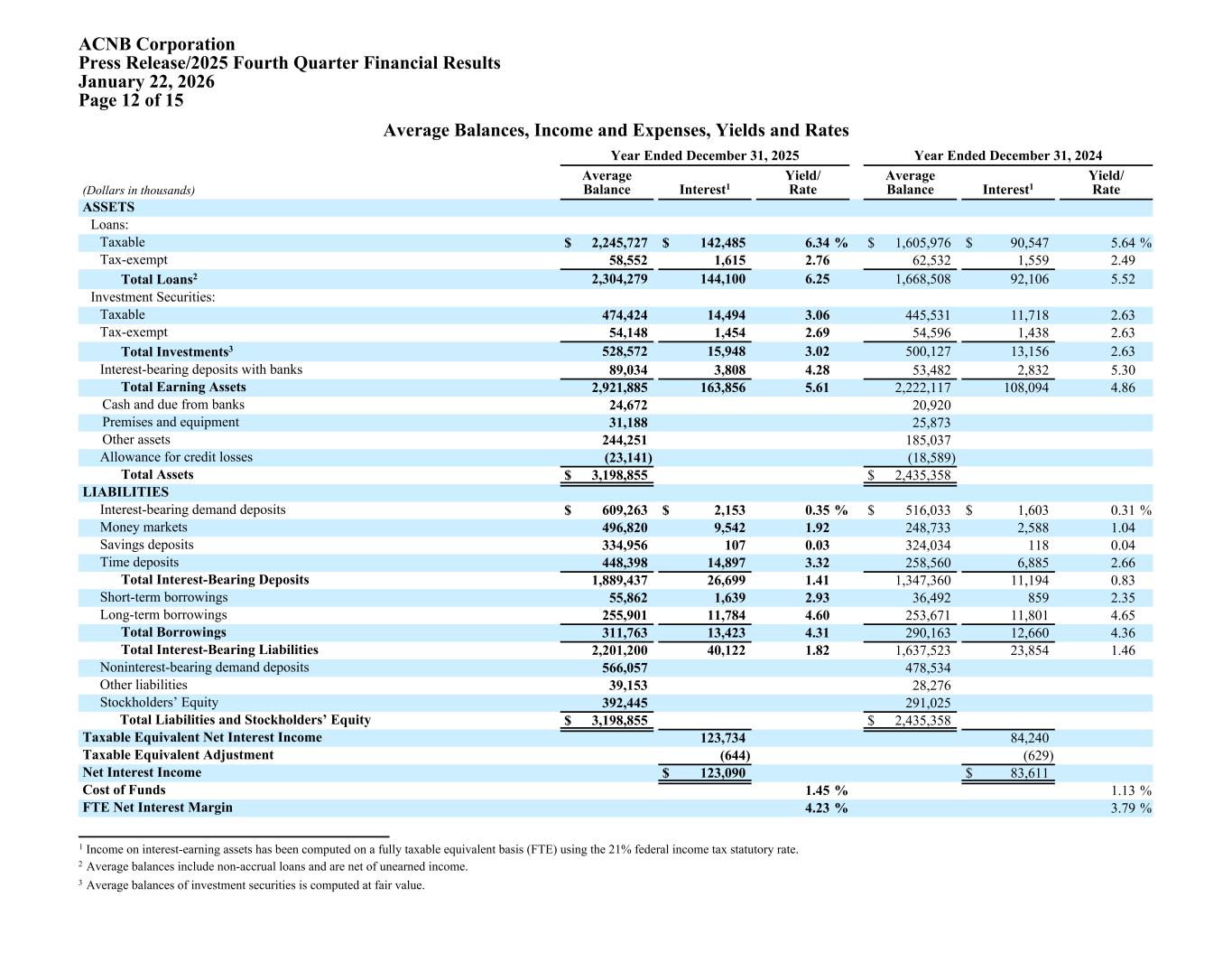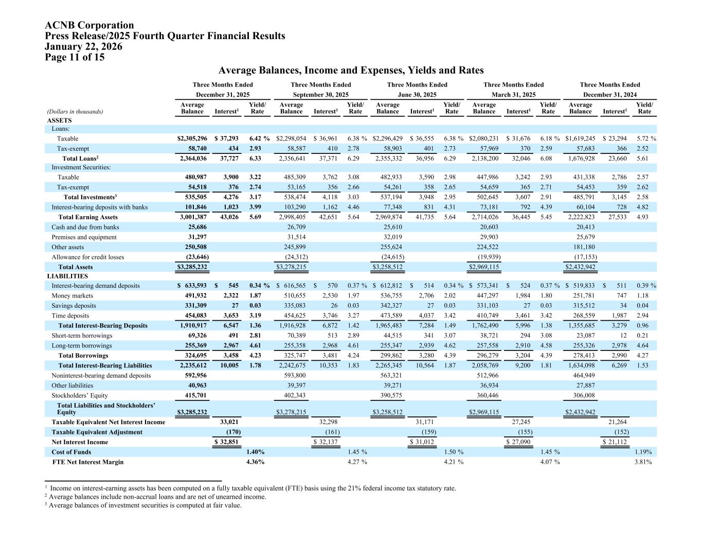 Average Balances, Income and Expenses, Yields and Rates Year Ended December 31, 2025 Year Ended December 31, 2024 (Dollars in thousands) Average Balance Interest1 Yield/ Rate Average Balance Interest1 Yield/ Rate ASSETS Loans: Taxable $ 2,245,727 $ 142,485 6.34 % $ 1,605,976 $ 90,547 5.64 % Tax-exempt 58,552 1,615 2.76 62,532 1,559 2.49 Total Loans2 2,304,279 144,100 6.25 1,668,508 92,106 5.52 Investment Securities: Taxable 474,424 14,494 3.06 445,531 11,718 2.63 Tax-exempt 54,148 1,454 2.69 54,596 1,438 2.63 Total Investments3 528,572 15,948 3.02 500,127 13,156 2.63 Interest-bearing deposits with banks 89,034 3,808 4.28 53,482 2,832 5.30 Total Earning Assets 2,921,885 163,856 5.61 2,222,117 108,094 4.86 Cash and due from banks 24,672 20,920 Premises and equipment 31,188 25,873 Other assets 244,251 185,037 Allowance for credit losses (23,141) (18,589) Total Assets $ 3,198,855 $ 2,435,358 LIABILITIES Interest-bearing demand deposits $ 609,263 $ 2,153 0.35 % $ 516,033 $ 1,603 0.31 % Money markets 496,820 9,542 1.92 248,733 2,588 1.04 Savings deposits 334,956 107 0.03 324,034 118 0.04 Time deposits 448,398 14,897 3.32 258,560 6,885 2.66 Total Interest-Bearing Deposits 1,889,437 26,699 1.41 1,347,360 11,194 0.83 Short-term borrowings 55,862 1,639 2.93 36,492 859 2.35 Long-term borrowings 255,901 11,784 4.60 253,671 11,801 4.65 Total Borrowings 311,763 13,423 4.31 290,163 12,660 4.36 Total Interest-Bearing Liabilities 2,201,200 40,122 1.82 1,637,523 23,854 1.46 Noninterest-bearing demand deposits 566,057 478,534 Other liabilities 39,153 28,276 Stockholders’ Equity 392,445 291,025 Total Liabilities and Stockholders’ Equity $ 3,198,855 $ 2,435,358 Taxable Equivalent Net Interest Income 123,734 84,240 Taxable Equivalent Adjustment (644) (629) Net Interest Income $ 123,090 $ 83,611 Cost of Funds 1.45 % 1.13 % FTE Net Interest Margin 4.23 % 3.79 % ACNB Corporation Press Release/2025 Fourth Quarter Financial Results January 22, 2026 Page 12 of 15 1 Income on interest-earning assets has been computed on a fully taxable equivalent basis (FTE) using the 21% federal income tax statutory rate. 2 Average balances include non-accrual loans and are net of unearned income. 3 Average balances of investment securities is computed at fair value.