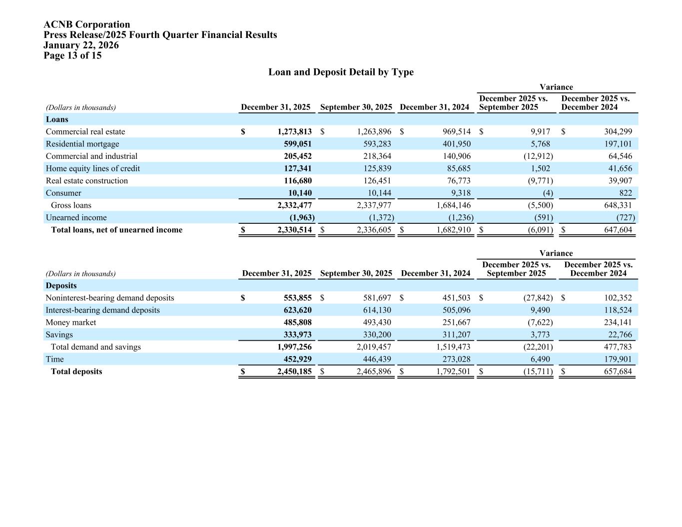 Loan and Deposit Detail by Type Variance (Dollars in thousands) December 31, 2025 September 30, 2025 December 31, 2024 December 2025 vs. September 2025 December 2025 vs. December 2024 Loans Commercial real estate $ 1,273,813 $ 1,263,896 $ 969,514 $ 9,917 $ 304,299 Residential mortgage 599,051 593,283 401,950 5,768 197,101 Commercial and industrial 205,452 218,364 140,906 (12,912) 64,546 Home equity lines of credit 127,341 125,839 85,685 1,502 41,656 Real estate construction 116,680 126,451 76,773 (9,771) 39,907 Consumer 10,140 10,144 9,318 (4) 822 Gross loans 2,332,477 2,337,977 1,684,146 (5,500) 648,331 Unearned income (1,963) (1,372) (1,236) (591) (727) Total loans, net of unearned income $ 2,330,514 $ 2,336,605 $ 1,682,910 $ (6,091) $ 647,604 Variance (Dollars in thousands) December 31, 2025 September 30, 2025 December 31, 2024 December 2025 vs. September 2025 December 2025 vs. December 2024 Deposits Noninterest-bearing demand deposits $ 553,855 $ 581,697 $ 451,503 $ (27,842) $ 102,352 Interest-bearing demand deposits 623,620 614,130 505,096 9,490 118,524 Money market 485,808 493,430 251,667 (7,622) 234,141 Savings 333,973 330,200 311,207 3,773 22,766 Total demand and savings 1,997,256 2,019,457 1,519,473 (22,201) 477,783 Time 452,929 446,439 273,028 6,490 179,901 Total deposits $ 2,450,185 $ 2,465,896 $ 1,792,501 $ (15,711) $ 657,684 ACNB Corporation Press Release/2025 Fourth Quarter Financial Results January 22, 2026 Page 13 of 15