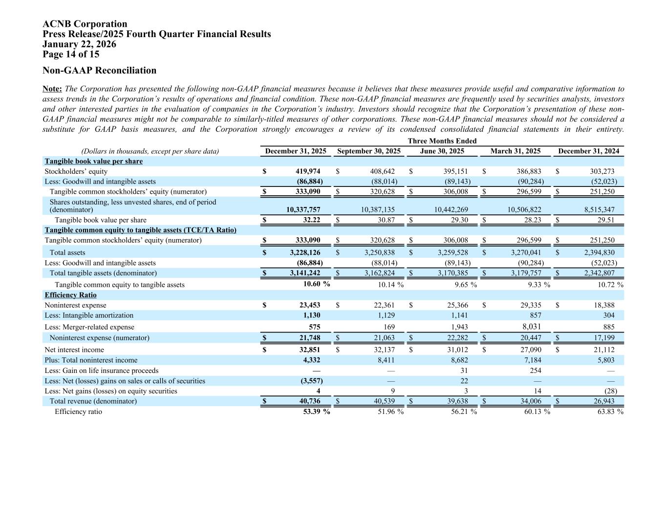 Non-GAAP Reconciliation Note: The Corporation has presented the following non-GAAP financial measures because it believes that these measures provide useful and comparative information to assess trends in the Corporation’s results of operations and financial condition. These non-GAAP financial measures are frequently used by securities analysts, investors and other interested parties in the evaluation of companies in the Corporation’s industry. Investors should recognize that the Corporation’s presentation of these non- GAAP financial measures might not be comparable to similarly-titled measures of other corporations. These non-GAAP financial measures should not be considered a substitute for GAAP basis measures, and the Corporation strongly encourages a review of its condensed consolidated financial statements in their entirety. Tangible book value per share Stockholders’ equity $ 419,974 $ 408,642 $ 395,151 $ 386,883 $ 303,273 Less: Goodwill and intangible assets (86,884) (88,014) (89,143) (90,284) (52,023) Tangible common stockholders’ equity (numerator) $ 333,090 $ 320,628 $ 306,008 $ 296,599 $ 251,250 Shares outstanding, less unvested shares, end of period (denominator) 10,337,757 10,387,135 10,442,269 10,506,822 8,515,347 Tangible book value per share $ 32.22 $ 30.87 $ 29.30 $ 28.23 $ 29.51 Tangible common equity to tangible assets (TCE/TA Ratio) Tangible common stockholders’ equity (numerator) $ 333,090 $ 320,628 $ 306,008 $ 296,599 $ 251,250 Total assets $ 3,228,126 $ 3,250,838 $ 3,259,528 $ 3,270,041 $ 2,394,830 Less: Goodwill and intangible assets (86,884) (88,014) (89,143) (90,284) (52,023) Total tangible assets (denominator) $ 3,141,242 $ 3,162,824 $ 3,170,385 $ 3,179,757 $ 2,342,807 Tangible common equity to tangible assets 10.60 % 10.14 % 9.65 % 9.33 % 10.72 % Efficiency Ratio Noninterest expense $ 23,453 $ 22,361 $ 25,366 $ 29,335 $ 18,388 Less: Intangible amortization 1,130 1,129 1,141 857 304 Less: Merger-related expense 575 169 1,943 8,031 885 Noninterest expense (numerator) $ 21,748 $ 21,063 $ 22,282 $ 20,447 $ 17,199 Net interest income $ 32,851 $ 32,137 $ 31,012 $ 27,090 $ 21,112 Plus: Total noninterest income 4,332 8,411 8,682 7,184 5,803 Less: Gain on life insurance proceeds — — 31 254 — Less: Net (losses) gains on sales or calls of securities (3,557) — 22 — — Less: Net gains (losses) on equity securities 4 9 3 14 (28) Total revenue (denominator) $ 40,736 $ 40,539 $ 39,638 $ 34,006 $ 26,943 Efficiency ratio 53.39 % 51.96 % 56.21 % 60.13 % 63.83 % Three Months Ended (Dollars in thousands, except per share data) December 31, 2025 September 30, 2025 June 30, 2025 March 31, 2025 December 31, 2024 ACNB Corporation Press Release/2025 Fourth Quarter Financial Results January 22, 2026 Page 14 of 15