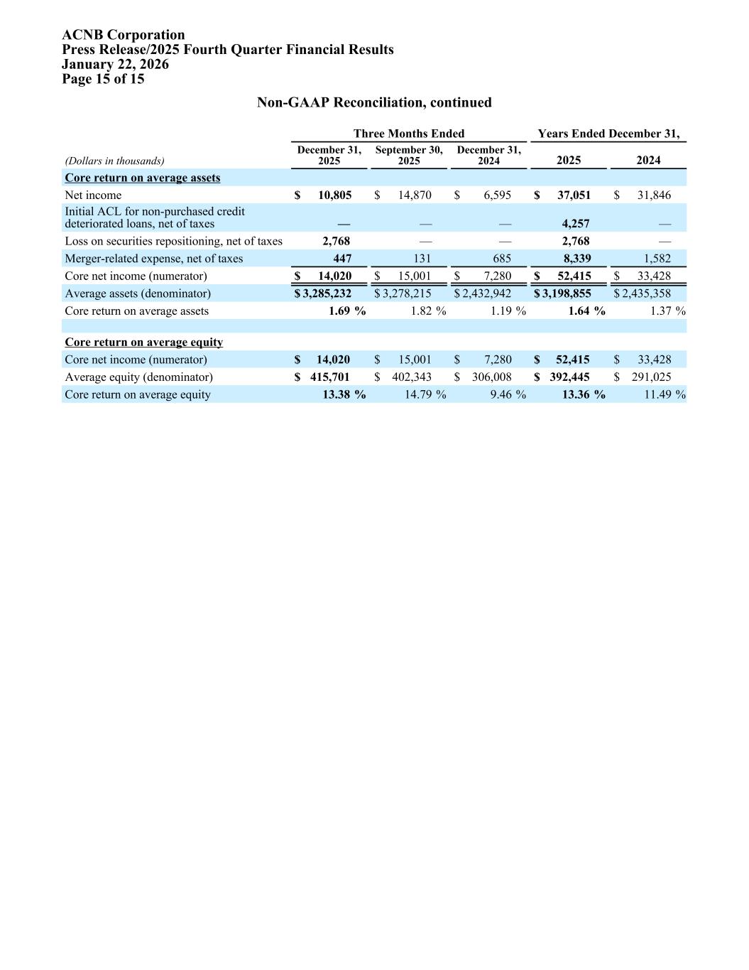 Non-GAAP Reconciliation, continued Three Months Ended Years Ended December 31, (Dollars in thousands) December 31, 2025 September 30, 2025 December 31, 2024 2025 2024 Core return on average assets Net income $ 10,805 $ 14,870 $ 6,595 $ 37,051 $ 31,846 Initial ACL for non-purchased credit deteriorated loans, net of taxes — — — 4,257 — Loss on securities repositioning, net of taxes 2,768 — — 2,768 — Merger-related expense, net of taxes 447 131 685 8,339 1,582 Core net income (numerator) $ 14,020 $ 15,001 $ 7,280 $ 52,415 $ 33,428 Average assets (denominator) $ 3,285,232 $ 3,278,215 $ 2,432,942 $ 3,198,855 $ 2,435,358 Core return on average assets 1.69 % 1.82 % 1.19 % 1.64 % 1.37 % Core return on average equity Core net income (numerator) $ 14,020 $ 15,001 $ 7,280 $ 52,415 $ 33,428 Average equity (denominator) $ 415,701 $ 402,343 $ 306,008 $ 392,445 $ 291,025 Core return on average equity 13.38 % 14.79 % 9.46 % 13.36 % 11.49 % ACNB Corporation Press Release/2025 Fourth Quarter Financial Results January 22, 2026 Page 15 of 15