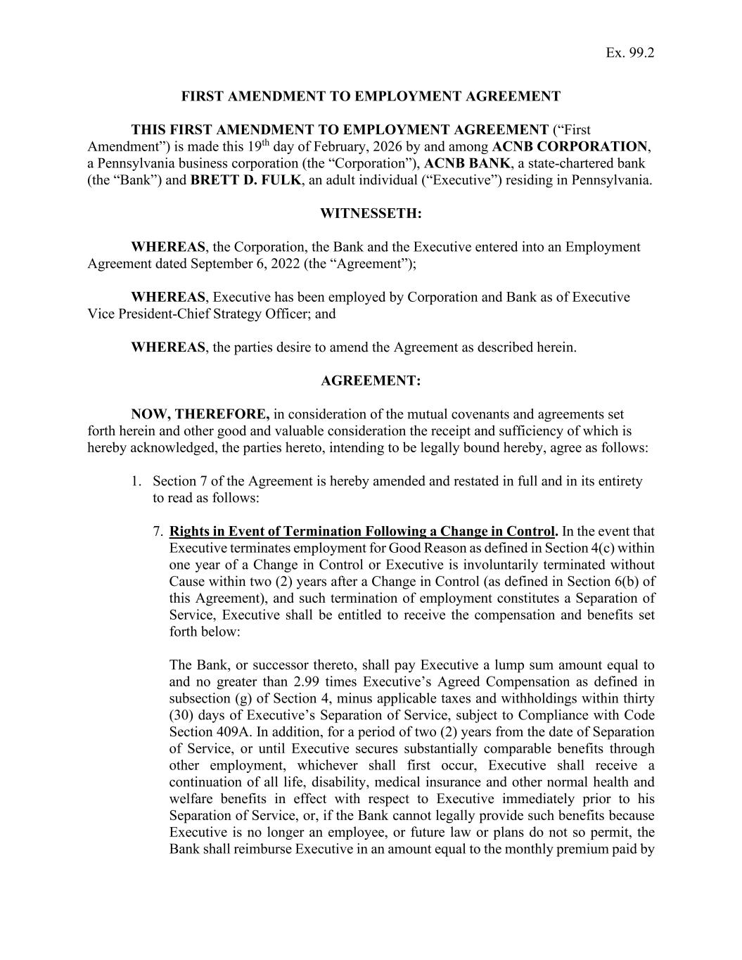 Ex. 99.2 FIRST AMENDMENT TO EMPLOYMENT AGREEMENT THIS FIRST AMENDMENT TO EMPLOYMENT AGREEMENT (“First Amendment”) is made this 19th day of February, 2026 by and among ACNB CORPORATION, a Pennsylvania business corporation (the “Corporation”), ACNB BANK, a state-chartered bank (the “Bank”) and BRETT D. FULK, an adult individual (“Executive”) residing in Pennsylvania. WITNESSETH: WHEREAS, the Corporation, the Bank and the Executive entered into an Employment Agreement dated September 6, 2022 (the “Agreement”); WHEREAS, Executive has been employed by Corporation and Bank as of Executive Vice President-Chief Strategy Officer; and WHEREAS, the parties desire to amend the Agreement as described herein. AGREEMENT: NOW, THEREFORE, in consideration of the mutual covenants and agreements set forth herein and other good and valuable consideration the receipt and sufficiency of which is hereby acknowledged, the parties hereto, intending to be legally bound hereby, agree as follows: 1. Section 7 of the Agreement is hereby amended and restated in full and in its entirety to read as follows: 7. Rights in Event of Termination Following a Change in Control. In the event that Executive terminates employment for Good Reason as defined in Section 4(c) within one year of a Change in Control or Executive is involuntarily terminated without Cause within two (2) years after a Change in Control (as defined in Section 6(b) of this Agreement), and such termination of employment constitutes a Separation of Service, Executive shall be entitled to receive the compensation and benefits set forth below: The Bank, or successor thereto, shall pay Executive a lump sum amount equal to and no greater than 2.99 times Executive’s Agreed Compensation as defined in subsection (g) of Section 4, minus applicable taxes and withholdings within thirty (30) days of Executive’s Separation of Service, subject to Compliance with Code Section 409A. In addition, for a period of two (2) years from the date of Separation of Service, or until Executive secures substantially comparable benefits through other employment, whichever shall first occur, Executive shall receive a continuation of all life, disability, medical insurance and other normal health and welfare benefits in effect with respect to Executive immediately prior to his Separation of Service, or, if the Bank cannot legally provide such benefits because Executive is no longer an employee, or future law or plans do not so permit, the Bank shall reimburse Executive in an amount equal to the monthly premium paid by