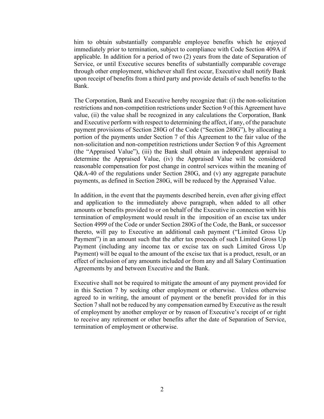 2 him to obtain substantially comparable employee benefits which he enjoyed immediately prior to termination, subject to compliance with Code Section 409A if applicable. In addition for a period of two (2) years from the date of Separation of Service, or until Executive secures benefits of substantially comparable coverage through other employment, whichever shall first occur, Executive shall notify Bank upon receipt of benefits from a third party and provide details of such benefits to the Bank. The Corporation, Bank and Executive hereby recognize that: (i) the non-solicitation restrictions and non-competition restrictions under Section 9 of this Agreement have value, (ii) the value shall be recognized in any calculations the Corporation, Bank and Executive perform with respect to determining the affect, if any, of the parachute payment provisions of Section 280G of the Code (“Section 280G”), by allocating a portion of the payments under Section 7 of this Agreement to the fair value of the non-solicitation and non-competition restrictions under Section 9 of this Agreement (the “Appraised Value”), (iii) the Bank shall obtain an independent appraisal to determine the Appraised Value, (iv) the Appraised Value will be considered reasonable compensation for post change in control services within the meaning of Q&A-40 of the regulations under Section 280G, and (v) any aggregate parachute payments, as defined in Section 280G, will be reduced by the Appraised Value. In addition, in the event that the payments described herein, even after giving effect and application to the immediately above paragraph, when added to all other amounts or benefits provided to or on behalf of the Executive in connection with his termination of employment would result in the imposition of an excise tax under Section 4999 of the Code or under Section 280G of the Code, the Bank, or successor thereto, will pay to Executive an additional cash payment (“Limited Gross Up Payment”) in an amount such that the after tax proceeds of such Limited Gross Up Payment (including any income tax or excise tax on such Limited Gross Up Payment) will be equal to the amount of the excise tax that is a product, result, or an effect of inclusion of any amounts included or from any and all Salary Continuation Agreements by and between Executive and the Bank. Executive shall not be required to mitigate the amount of any payment provided for in this Section 7 by seeking other employment or otherwise. Unless otherwise agreed to in writing, the amount of payment or the benefit provided for in this Section 7 shall not be reduced by any compensation earned by Executive as the result of employment by another employer or by reason of Executive’s receipt of or right to receive any retirement or other benefits after the date of Separation of Service, termination of employment or otherwise.