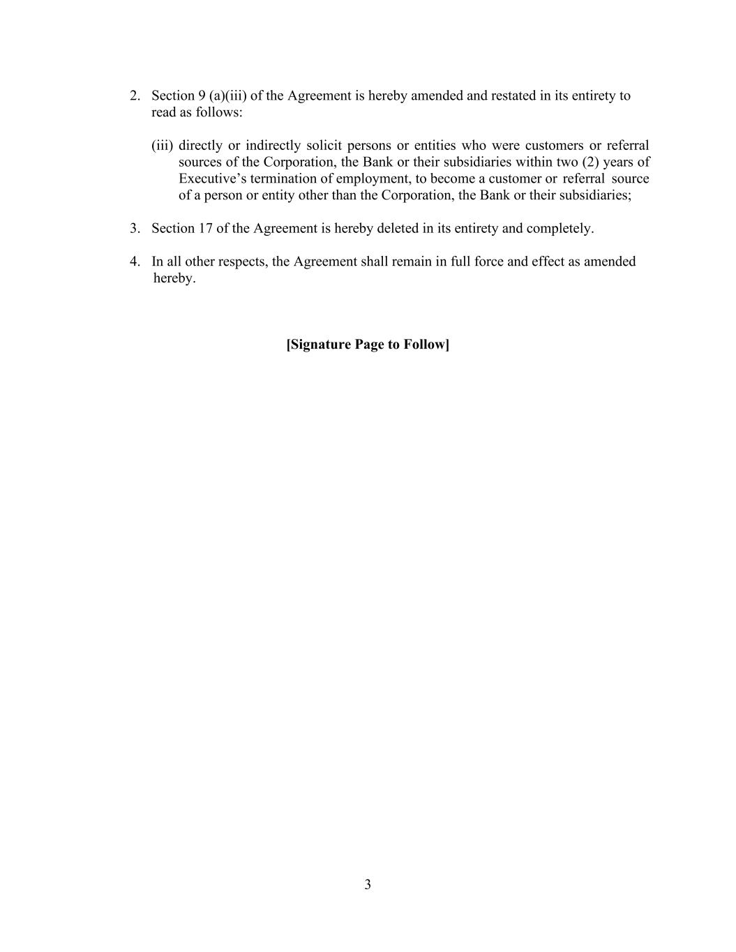 3 2. Section 9 (a)(iii) of the Agreement is hereby amended and restated in its entirety to read as follows: (iii) directly or indirectly solicit persons or entities who were customers or referral sources of the Corporation, the Bank or their subsidiaries within two (2) years of Executive’s termination of employment, to become a customer or referral source of a person or entity other than the Corporation, the Bank or their subsidiaries; 3. Section 17 of the Agreement is hereby deleted in its entirety and completely. 4. In all other respects, the Agreement shall remain in full force and effect as amended hereby. [Signature Page to Follow]