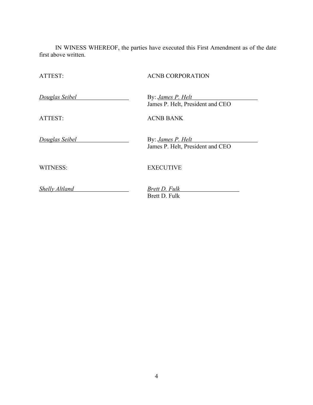 4 IN WINESS WHEREOF, the parties have executed this First Amendment as of the date first above written. ATTEST: ACNB CORPORATION Douglas Seibel By: James P. Helt James P. Helt, President and CEO ATTEST: ACNB BANK Douglas Seibel By: James P. Helt James P. Helt, President and CEO WITNESS: EXECUTIVE Shelly Altland Brett D. Fulk Brett D. Fulk