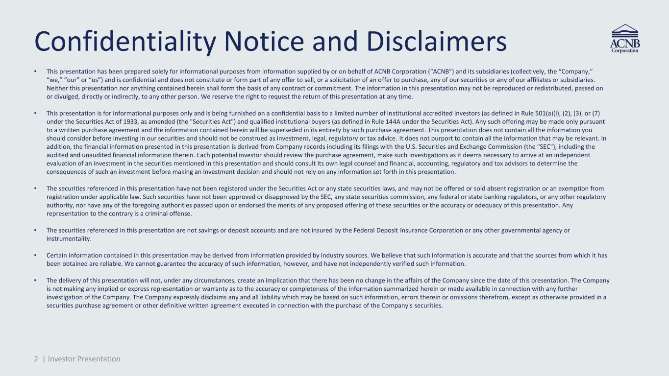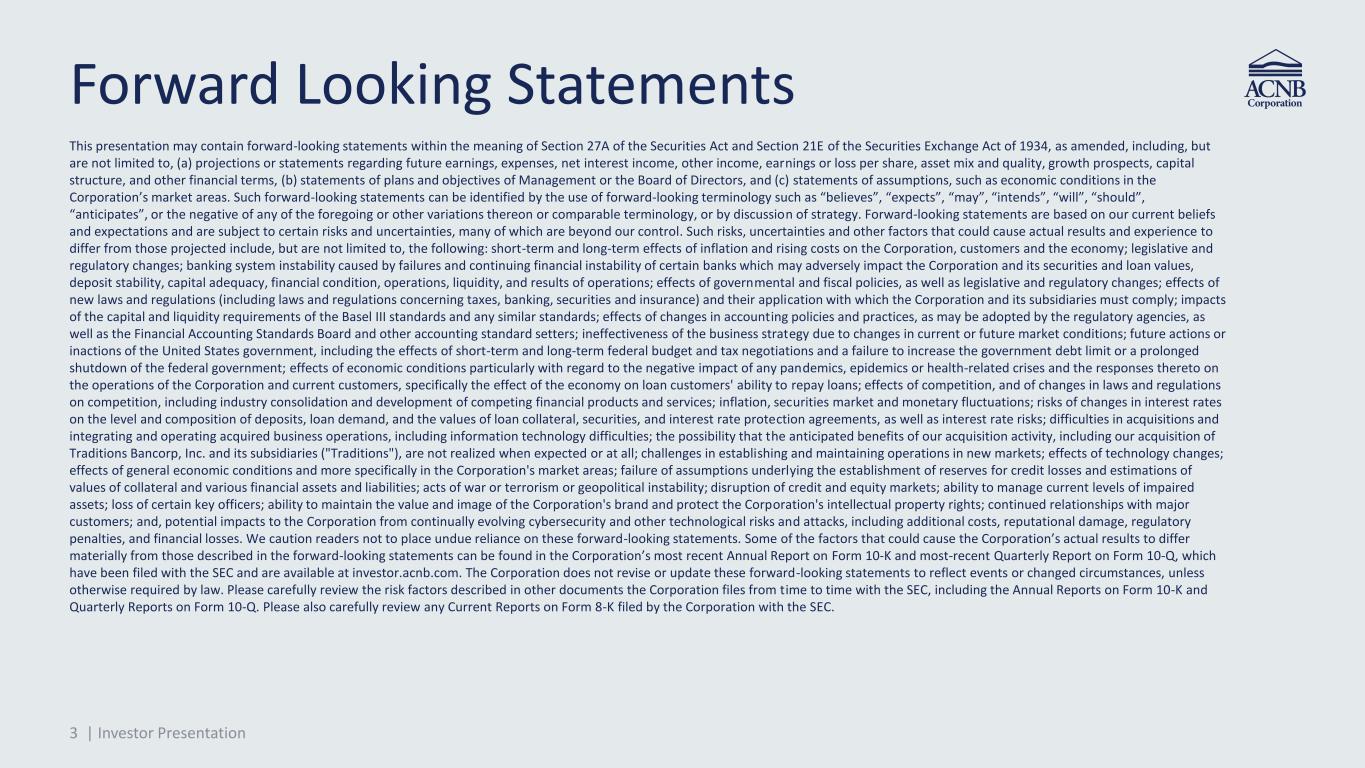 2 | Investor Presentation Confidentiality Notice and Disclaimers • This presentation has been prepared solely for informational purposes from information supplied by or on behalf of ACNB Corporation (“ACNB”) and its subsidiaries (collectively, the “Company,” “we,” “our” or “us”) and is confidential and does not constitute or form part of any offer to sell, or a solicitation of an offer to purchase, any of our securities or any of our affiliates or subsidiaries. Neither this presentation nor anything contained herein shall form the basis of any contract or commitment. The information in this presentation may not be reproduced or redistributed, passed on or divulged, directly or indirectly, to any other person. We reserve the right to request the return of this presentation at any time. • This presentation is for informational purposes only and is being furnished on a confidential basis to a limited number of institutional accredited investors (as defined in Rule 501(a)(l), (2), (3), or (7) under the Securities Act of 1933, as amended (the "Securities Act") and qualified institutional buyers (as defined in Rule 144A under the Securities Act). Any such offering may be made only pursuant to a written purchase agreement and the information contained herein will be superseded in its entirety by such purchase agreement. This presentation does not contain all the information you should consider before investing in our securities and should not be construed as investment, legal, regulatory or tax advice. It does not purport to contain all the information that may be relevant. ln addition, the financial information presented in this presentation is derived from Company records including its filings with the U.S. Securities and Exchange Commission (the "SEC"), including the audited and unaudited financial information therein. Each potential investor should review the purchase agreement, make such investigations as it deems necessary to arrive at an independent evaluation of an investment in the securities mentioned in this presentation and should consult its own legal counsel and financial, accounting, regulatory and tax advisors to determine the consequences of such an investment before making an investment decision and should not rely on any information set forth in this presentation. • The securities referenced in this presentation have not been registered under the Securities Act or any state securities laws, and may not be offered or sold absent registration or an exemption from registration under applicable law. Such securities have not been approved or disapproved by the SEC, any state securities commission, any federal or state banking regulators, or any other regulatory authority, nor have any of the foregoing authorities passed upon or endorsed the merits of any proposed offering of these securities or the accuracy or adequacy of this presentation. Any representation to the contrary is a criminal offense. • The securities referenced in this presentation are not savings or deposit accounts and are not insured by the Federal Deposit Insurance Corporation or any other governmental agency or instrumentality. • Certain information contained in this presentation may be derived from information provided by industry sources. We believe that such information is accurate and that the sources from which it has been obtained are reliable. We cannot guarantee the accuracy of such information, however, and have not independently verified such information. • The delivery of this presentation will not, under any circumstances, create an implication that there has been no change in the affairs of the Company since the date of this presentation. The Company is not making any implied or express representation or warranty as to the accuracy or completeness of the information summarized herein or made available in connection with any further investigation of the Company. The Company expressly disclaims any and all liability which may be based on such information, errors therein or omissions therefrom, except as otherwise provided in a securities purchase agreement or other definitive written agreement executed in connection with the purchase of the Company's securities.