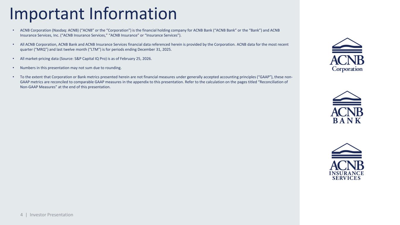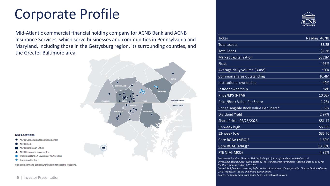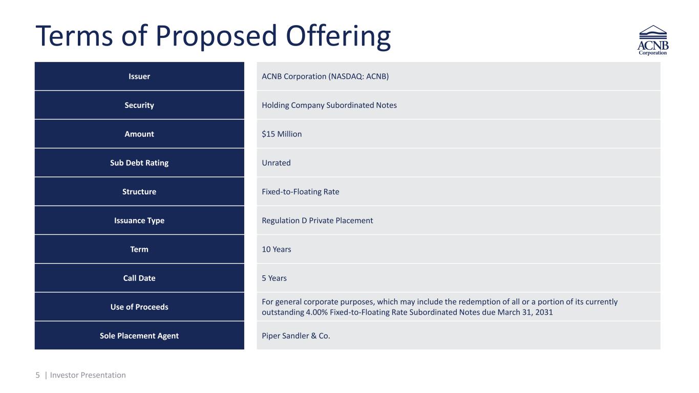 4 | Investor Presentation Important Information • ACNB Corporation (Nasdaq: ACNB) (“ACNB” or the “Corporation”) is the financial holding company for ACNB Bank (“ACNB Bank” or the “Bank”) and ACNB Insurance Services, Inc. (“ACNB Insurance Services,” “ACNB Insurance” or “Insurance Services”). • All ACNB Corporation, ACNB Bank and ACNB Insurance Services financial data referenced herein is provided by the Corporation. ACNB data for the most recent quarter (“MRQ”) and last twelve month (“LTM”) is for periods ending December 31, 2025. • All market-pricing data (Source: S&P Capital IQ Pro) is as of February 25, 2026. • Numbers in this presentation may not sum due to rounding. • To the extent that Corporation or Bank metrics presented herein are not financial measures under generally accepted accounting principles (“GAAP”), these non- GAAP metrics are reconciled to comparable GAAP measures in the appendix to this presentation. Refer to the calculation on the pages titled “Reconciliation of Non-GAAP Measures” at the end of this presentation. Investor Presentation