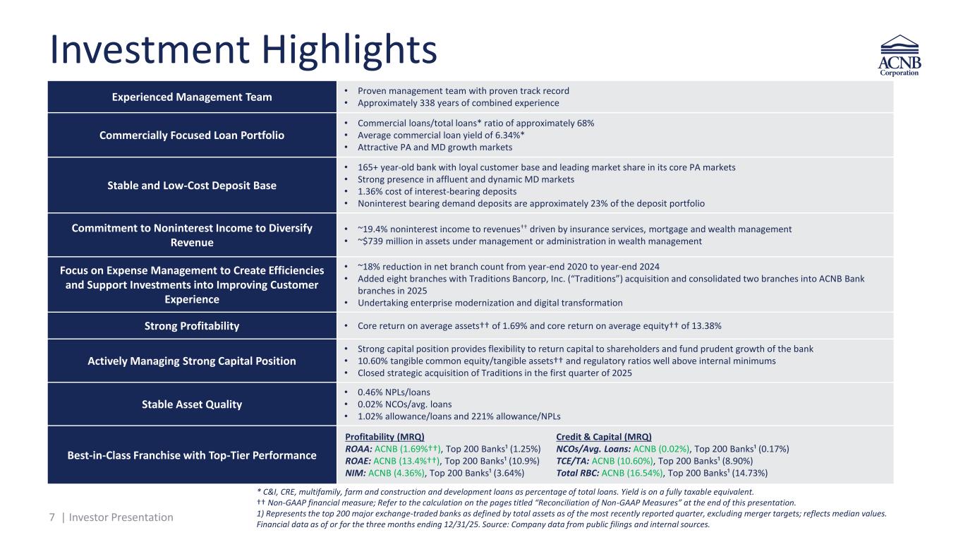 6 | Investor Presentation Corporate Profile Mid-Atlantic commercial financial holding company for ACNB Bank and ACNB Insurance Services, which serve businesses and communities in Pennsylvania and Maryland, including those in the Gettysburg region, its surrounding counties, and the Greater Baltimore area. Market-pricing data (Source: S&P Capital IQ Pro) is as of the date provided on p. 4 Ownership data (Source: S&P Capital IQ Pro) is most recent available; Financial data as of or for the three months ending 12/31/25 . *Non-GAAP financial measure; Refer to the calculation on the pages titled “Reconciliation of Non- GAAP Measures” at the end of this presentation. Source: Company data from public filings and internal sources. Ticker Nasdaq: ACNB Total assets $3.2B Total loans $2.3B Market capitalization $531M Float ~96% Average daily volume (3-mo) ~30K Common shares outstanding 10.4M Institutional ownership ~40% Insider ownership ~4% Price/EPS (NTM) 10.08x Price/Book Value Per Share 1.26x Price/Tangible Book Value Per Share* 1.59x Dividend Yield 2.97% Share Price - 02/25/2026 $51.17 52-week high $53.89 52-week low $35.70 Core ROAA (MRQ)* 1.69% Core ROAE (MRQ)* 13.38% FTE NIM (MRQ) 4.36% BERKS