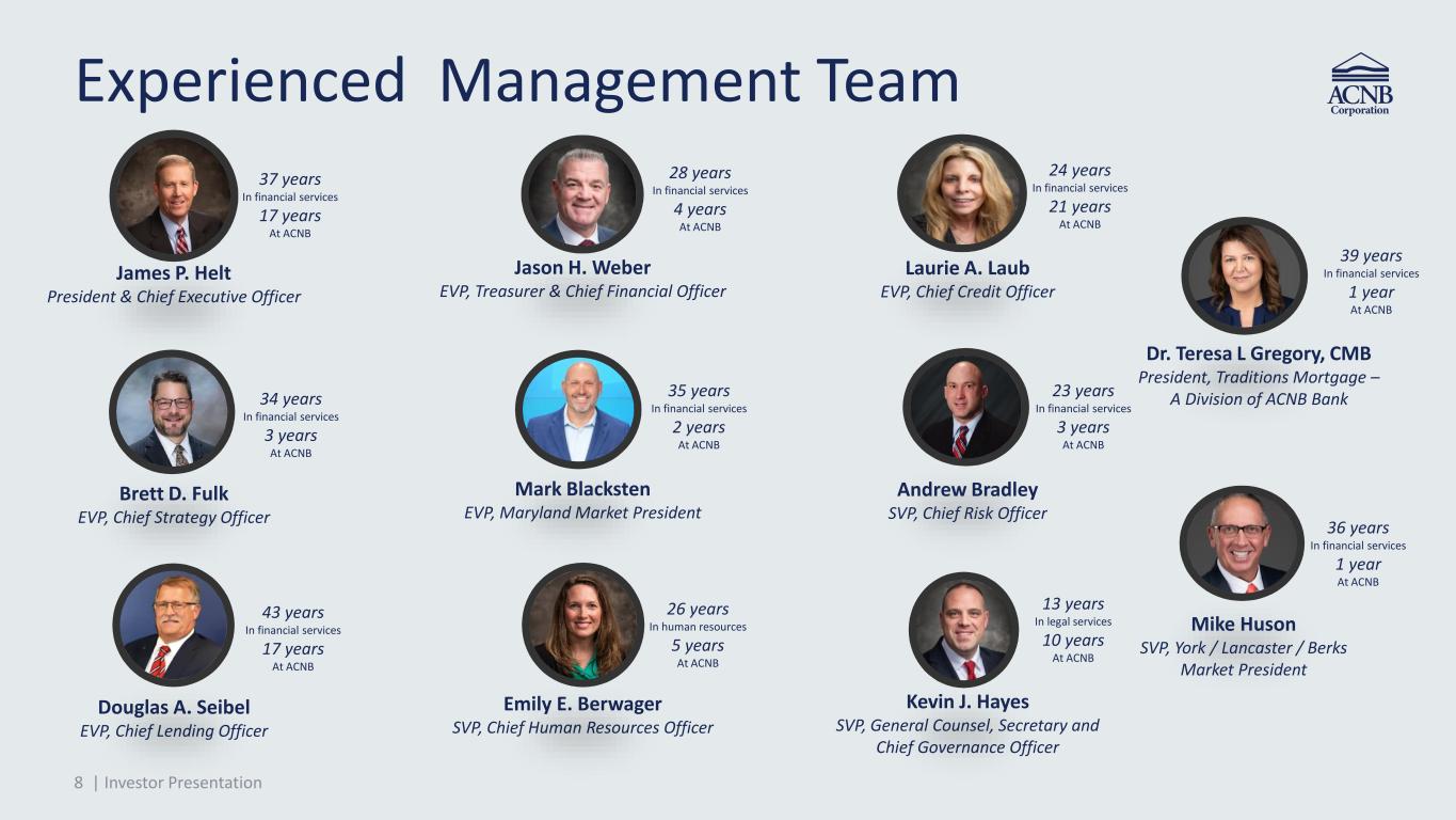7 | Investor Presentation Experienced Management Team • Proven management team with proven track record • Approximately 338 years of combined experience Commercially Focused Loan Portfolio • Commercial loans/total loans* ratio of approximately 68% • Average commercial loan yield of 6.34%* • Attractive PA and MD growth markets Stable and Low-Cost Deposit Base • 165+ year-old bank with loyal customer base and leading market share in its core PA markets • Strong presence in affluent and dynamic MD markets • 1.36% cost of interest-bearing deposits • Noninterest bearing demand deposits are approximately 23% of the deposit portfolio Commitment to Noninterest Income to Diversify Revenue • ~19.4% noninterest income to revenues†† driven by insurance services, mortgage and wealth management • ~$739 million in assets under management or administration in wealth management Focus on Expense Management to Create Efficiencies and Support Investments into Improving Customer Experience • ~18% reduction in net branch count from year-end 2020 to year-end 2024 • Added eight branches with Traditions Bancorp, Inc. (“Traditions”) acquisition and consolidated two branches into ACNB Bank branches in 2025 • Undertaking enterprise modernization and digital transformation Strong Profitability • Core return on average assets†† of 1.69% and core return on average equity†† of 13.38% Actively Managing Strong Capital Position • Strong capital position provides flexibility to return capital to shareholders and fund prudent growth of the bank • 10.60% tangible common equity/tangible assets†† and regulatory ratios well above internal minimums • Closed strategic acquisition of Traditions in the first quarter of 2025 Stable Asset Quality • 0.46% NPLs/loans • 0.02% NCOs/avg. loans • 1.02% allowance/loans and 221% allowance/NPLs Best-in-Class Franchise with Top-Tier Performance Investment Highlights * C&I, CRE, multifamily, farm and construction and development loans as percentage of total loans. Yield is on a fully taxable equivalent. †† Non-GAAP financial measure; Refer to the calculation on the pages titled “Reconciliation of Non-GAAP Measures” at the end of this presentation. 1) Represents the top 200 major exchange-traded banks as defined by total assets as of the most recently reported quarter, excluding merger targets; reflects median values. Financial data as of or for the three months ending 12/31/25. Source: Company data from public filings and internal sources. Profitability (MRQ) ROAA: ACNB (1.69%††), Top 200 Banks¹ (1.25%) ROAE: ACNB (13.4%††), Top 200 Banks¹ (10.9%) NIM: ACNB (4.36%), Top 200 Banks¹ (3.64%) Credit & Capital (MRQ) NCOs/Avg. Loans: ACNB (0.02%), Top 200 Banks¹ (0.17%) TCE/TA: ACNB (10.60%), Top 200 Banks¹ (8.90%) Total RBC: ACNB (16.54%), Top 200 Banks¹ (14.73%)
