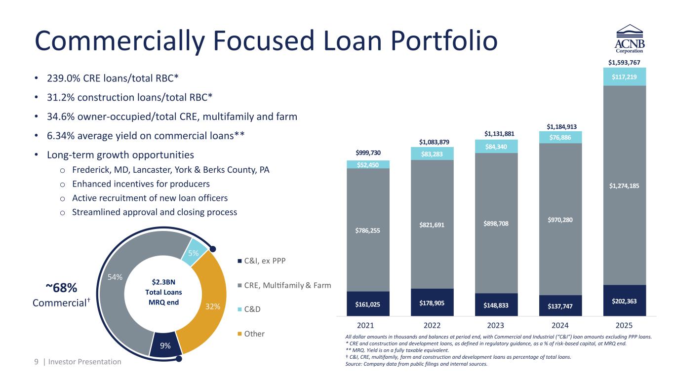 8 | Investor Presentation Experienced Management Team James P. Helt President & Chief Executive Officer 37 years In financial services 17 years At ACNB Brett D. Fulk EVP, Chief Strategy Officer 34 years In financial services 3 years At ACNB Emily E. Berwager SVP, Chief Human Resources Officer 26 years In human resources 5 years At ACNB 23 years In financial services 3 years At ACNB Andrew Bradley SVP, Chief Risk Officer Jason H. Weber EVP, Treasurer & Chief Financial Officer 28 years In financial services 4 years At ACNB Douglas A. Seibel EVP, Chief Lending Officer 43 years In financial services 17 years At ACNB Laurie A. Laub EVP, Chief Credit Officer 24 years In financial services 21 years At ACNB Mark Blacksten EVP, Maryland Market President 35 years In financial services 2 years At ACNB Kevin J. Hayes SVP, General Counsel, Secretary and Chief Governance Officer 13 years In legal services 10 years At ACNB 36 years In financial services 1 year At ACNB Mike Huson SVP, York / Lancaster / Berks Market President Dr. Teresa L Gregory, CMB President, Traditions Mortgage – A Division of ACNB Bank 39 years In financial services 1 year At ACNB