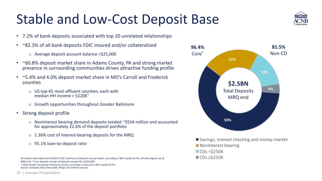 9 | Investor Presentation 9% 54% 5% 32% C I, ex PPP CR , Mul family arm C D ther ~68% Commercial† Commercially Focused Loan Portfolio • 239.0% CRE loans/total RBC* • 31.2% construction loans/total RBC* • 34.6% owner-occupied/total CRE, multifamily and farm • 6.34% average yield on commercial loans** • Long-term growth opportunities o Frederick, MD, Lancaster, York & Berks County, PA o Enhanced incentives for producers o Active recruitment of new loan officers o Streamlined approval and closing process All dollar amounts in thousands and balances at period end, with Commercial and Industrial (“C&I”) loan amounts excluding PPP loans. * CRE and construction and development loans, as defined in regulatory guidance, as a % of risk-based capital, at MRQ end. ** MRQ. Yield is on a fully taxable equivalent. † C&I, CRE, multifamily, farm and construction and development loans as percentage of total loans. Source: Company data from public filings and internal sources. $1,593,767 $2.3BN Total Loans MRQ end 2021 2022 2023 2024 2025