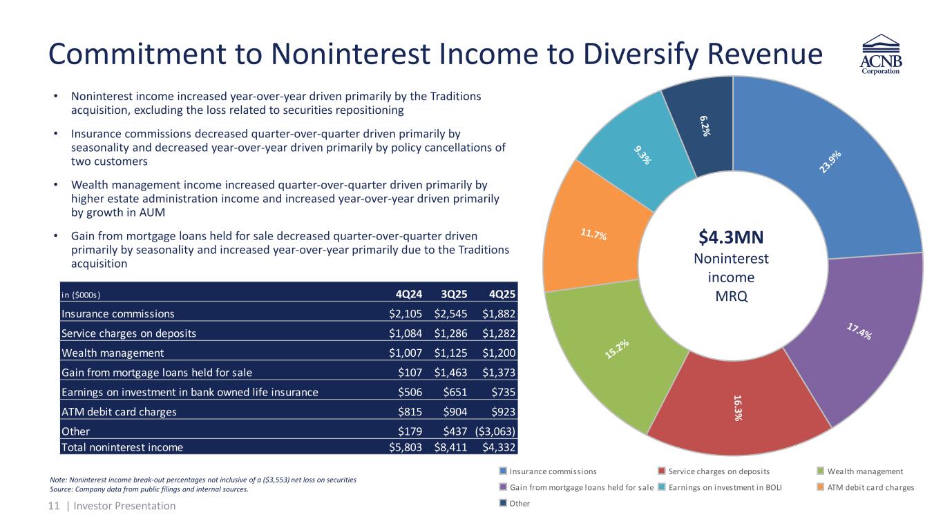 10 | Investor Presentation Stable and Low-Cost Deposit Base • 7.2% of bank deposits associated with top 20 unrelated relationships • ~82.3% of all bank deposits FDIC insured and/or collateralized o Average deposit account balance <$25,000 • ~60.8% deposit market share in Adams County, PA and strong market presence in surrounding communities drives attractive funding profile • ~5.4% and 4.0% deposit market share in MD’s Carroll and rederick counties o US top-65 most-affluent counties, each with median HH income > $120K† o Growth opportunities throughout Greater Baltimore • Strong deposit profile o Noninterest bearing demand deposits totaled ~$554 million and accounted for approximately 22.6% of the deposit portfolio o 1.36% cost of interest-bearing deposits for the MRQ o 95.1% loan-to-deposit ratio All market share data from 6/30/25 FDIC Summary of Deposits annual report, according to S&P Capital IQ Pro; All other figures as of MRQ end. * Core deposits include all deposits except CDs ≥$250,000. † 2026 median household income by county, according to data from S&P Capital IQ Pro. 96.4% Core* $2.5BN Total Deposits MRQ end 81.5% Non-CD Source: Company data from public filings and internal sources. Savings, interest checking and money market Noninterest bearing CDs 250 CDs 250