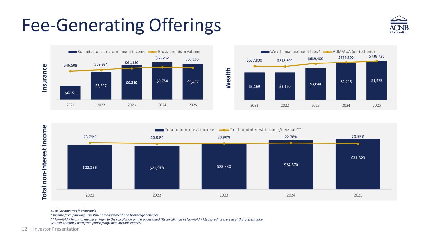 11 | Investor Presentation Commitment to Noninterest Income to Diversify Revenue • Noninterest income increased year-over-year driven primarily by the Traditions acquisition, excluding the loss related to securities repositioning • Insurance commissions decreased quarter-over-quarter driven primarily by seasonality and decreased year-over-year driven primarily by policy cancellations of two customers • Wealth management income increased quarter-over-quarter driven primarily by higher estate administration income and increased year-over-year driven primarily by growth in AUM • Gain from mortgage loans held for sale decreased quarter-over-quarter driven primarily by seasonality and increased year-over-year primarily due to the Traditions acquisition $4.3MN Noninterest income MRQin ($000s) 4Q24 3Q25 4Q25 Insurance commissions $2,105 $2,545 $1,882 Service charges on deposits $1,084 $1,286 $1,282 Wealth management $1,007 $1,125 $1,200 Gain from mortgage loans held for sale $107 $1,463 $1,373 Earnings on investment in bank owned life insurance $506 $651 $735 ATM debit card charges $815 $904 $923 Other $179 $437 ($3,063) Total noninterest income $5,803 $8,411 $4,332 Note: Noninterest income break-out percentages not inclusive of a ($3,553) net loss on securities Source: Company data from public filings and internal sources. Insurance commissions Service charges on deposits ealth management Gain from mortgage loans held for sale arnings on investment in B LI ATM debit card charges ther