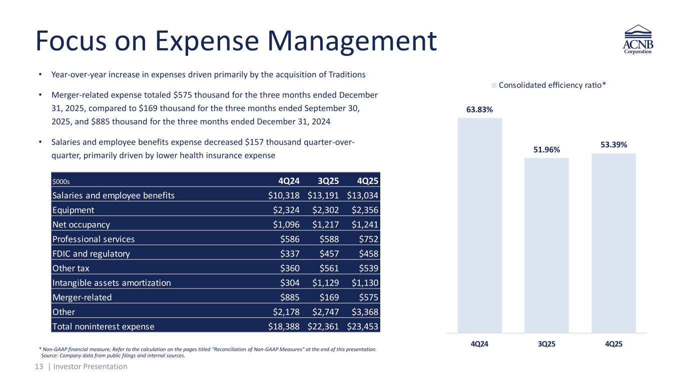 12 | Investor Presentation Fee-Generating Offerings All dollar amounts in thousands. * Income from fiduciary, investment management and brokerage activities. ** Non-GAAP financial measure; Refer to the calculation on the pages titled “Reconciliation of Non-GAAP Measures” at the end of this presentation. Source: Company data from public filings and internal sources. In su ra n ce W e al th To ta l n o n -i n te re st in co m e 6,151 8,30 9,319 9, 54 9,482 46,508 52,994 61,180 66,252 65,165 2021 2022 2023 2024 2025 Commiss ions and con ngent income Gross premium volume 3,169 3,160 3,644 4,226 4,4 5 53 ,800 518,800 639,400 683,800 38, 25 2021 2022 2023 2024 2025 ealth management fees A M/A A (period end) 22,236 21,918 23,330 24,6 0 31,829 23. 9% 20.81% 20.90% 22. 8% 20.55% 2021 2022 2023 2024 2025 Total noninterest income Total noninterest income/revenue