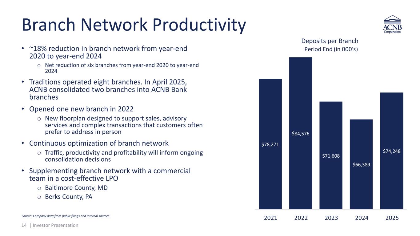 13 | Investor Presentation Focus on Expense Management * Non-GAAP financial measure; Refer to the calculation on the pages titled “Reconciliation of Non-GAAP Measures” at the end of this presentation. • Year-over-year increase in expenses driven primarily by the acquisition of Traditions • Merger-related expense totaled $575 thousand for the three months ended December 31, 2025, compared to $169 thousand for the three months ended September 30, 2025, and $885 thousand for the three months ended December 31, 2024 • Salaries and employee benefits expense decreased $157 thousand quarter-over- quarter, primarily driven by lower health insurance expense Source: Company data from public filings and internal sources. Consolidated e ciency ra o $000s 4Q24 3Q25 4Q25 Salaries and employee benefits $10,318 $13,191 $13,034 Equipment $2,324 $2,302 $2,356 Net occupancy $1,096 $1,217 $1,241 Professional services $586 $588 $752 FDIC and regulatory $337 $457 $458 Other tax $360 $561 $539 Intangible assets amortization $304 $1,129 $1,130 Merger-related $885 $169 $575 Other $2,178 $2,747 $3,368 Total noninterest expense $18,388 $22,361 $23,453
