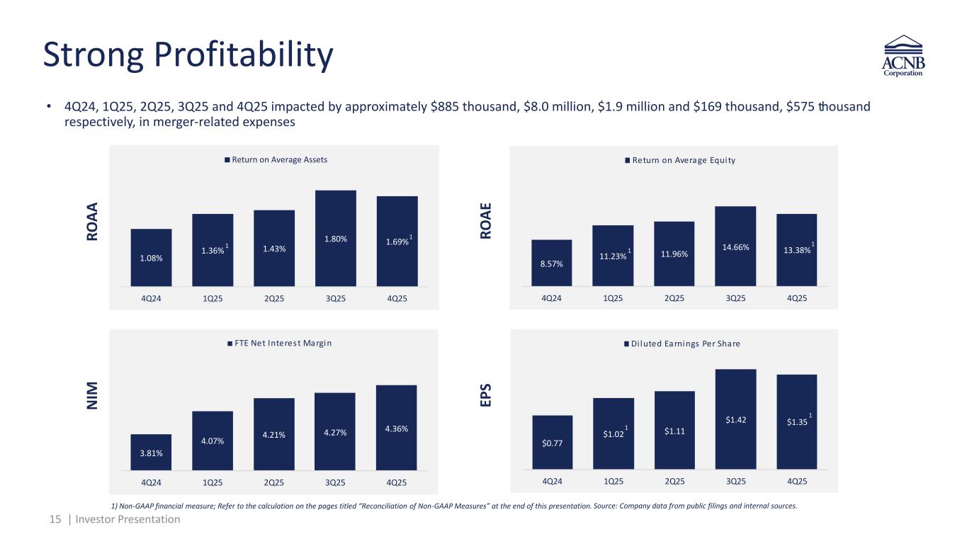 14 | Investor Presentation Branch Network Productivity • ~18% reduction in branch network from year-end 2020 to year-end 2024 o Net reduction of six branches from year-end 2020 to year-end 2024 • Traditions operated eight branches. In April 2025, ACNB consolidated two branches into ACNB Bank branches • Opened one new branch in 2022 o New floorplan designed to support sales, advisory services and complex transactions that customers often prefer to address in person • Continuous optimization of branch network o Traffic, productivity and profitability will inform ongoing consolidation decisions • Supplementing branch network with a commercial team in a cost-effective LPO o Baltimore County, MD o Berks County, PA Source: Company data from public filings and internal sources. 8,2 1 84,5 6 1,608 66,389 4,248 2021 2022 2023 2024 2025 Deposits per Branch Period nd (in 000 s)