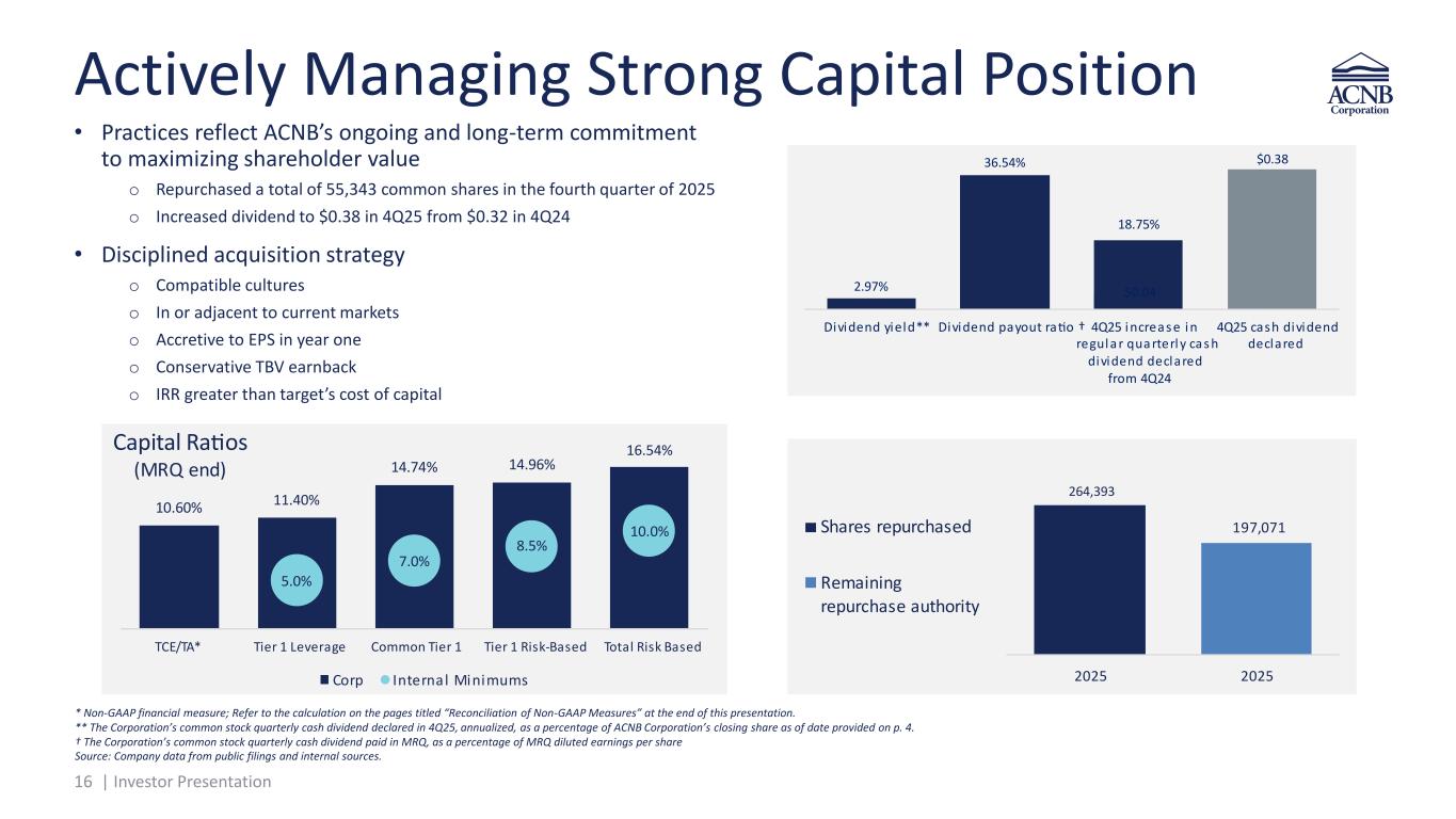 15 | Investor Presentation 0. 1.02 1.11 1.42 1.35 4Q24 1Q25 2Q25 3Q25 4Q25 Di luted arnings Per Share 8.5 % 11.23% 11.96% 14.66% 13.38% 4Q24 1Q25 2Q25 3Q25 4Q25 Return on Average quity 1.08% 1.36% 1.43% 1.80% 1.69% 4Q24 1Q25 2Q25 3Q25 4Q25 Return on Average Assets Strong Profitability • 4Q24, 1Q25, 2Q25, 3Q25 and 4Q25 impacted by approximately $885 thousand, $8.0 million, $1.9 million and $169 thousand, $575 thousand respectively, in merger-related expenses R O A A R O A E N IM EP S Source: Company data from public filings and internal sources.1) Non-GAAP financial measure; Refer to the calculation on the pages titled “Reconciliation of Non-GAAP Measures” at the end of this presentation. 3.81% 4.0 % 4.21% 4.2 % 4.36% 4Q24 1Q25 2Q25 3Q25 4Q25 T Net Interest Margin 1 1 1 1 1 1