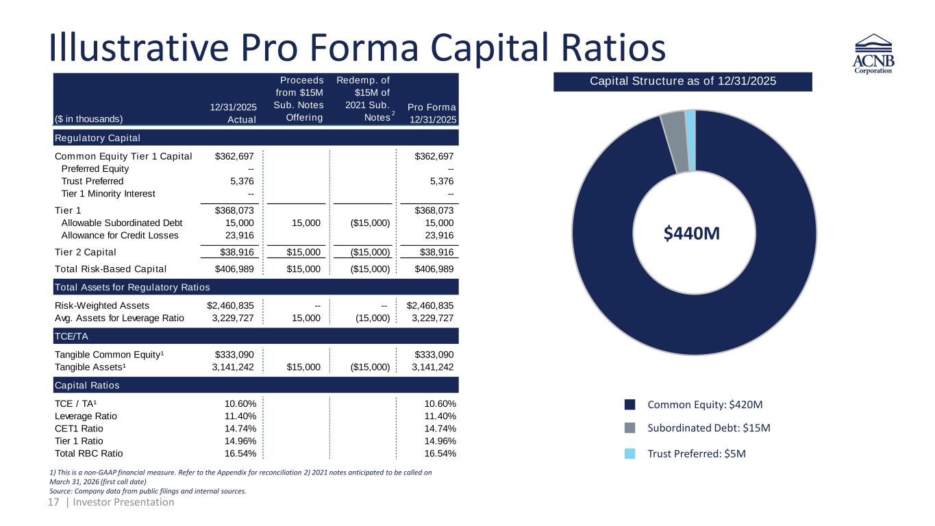 16 | Investor Presentation Actively Managing Strong Capital Position • Practices reflect ACNB’s ongoing and long-term commitment to maximizing shareholder value o Repurchased a total of 55,343 common shares in the fourth quarter of 2025 o Increased dividend to $0.38 in 4Q25 from $0.32 in 4Q24 • Disciplined acquisition strategy o Compatible cultures o In or adjacent to current markets o Accretive to EPS in year one o Conservative TBV earnback o IRR greater than target’s cost of capital * Non-GAAP financial measure; Refer to the calculation on the pages titled “Reconciliation of Non-GAAP Measures” at the end of this presentation. ** The Corporation’s common stock quarterly cash dividend declared in 4Q25, annualized, as a percentage of ACNB Corporation’s closing share as of date provided on p. 4. † The Corporation’s common stock quarterly cash dividend paid in MRQ, as a percentage of MRQ diluted earnings per share Source: Company data from public filings and internal sources. 10.60% 11.40% 14. 4% 14.96% 16.54% 5.0% .0% 8.5% 10.0% TC /TA Tier 1 Leverage Common Tier 1 Tier 1 Risk Based Total Risk Based Capital Ra os (MRQ end) Corp Internal Minimums 264,393 19 ,0 1 2025 2025 Shares repurchased Remaining repurchase authority 2.9 % 36.54% 18. 5% 0.04 0.38 Dividend yield Dividend payout ra o 4Q25 increase in regula r quarterl y cash dividend declared from 4Q24 4Q25 cash dividend declared