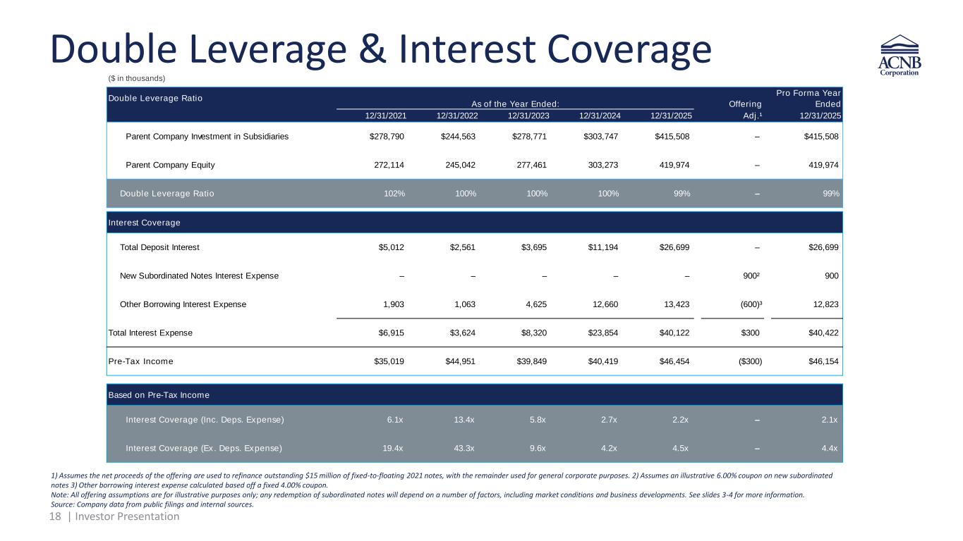 17 | Investor Presentation Illustrative Pro Forma Capital Ratios Capital Structure as of 12/31/2025 1) This is a non-GAAP financial measure. Refer to the Appendix for reconciliation 2) 2021 notes anticipated to be called on March 31, 2026 (first call date) Source: Company data from public filings and internal sources. ($ in thousands) Regulatory Capital Common Equity Tier 1 Capital $362,697 $362,697 Preferred Equity -- -- Trust Preferred 5,376 5,376 Tier 1 Minority Interest -- -- Tier 1 $368,073 $368,073 Allowable Subordinated Debt 15,000 15,000 ($15,000) 15,000 Allowance for Credit Losses 23,916 23,916 Tier 2 Capital $38,916 $15,000 ($15,000) $38,916 Total Risk-Based Capital $406,989 $15,000 ($15,000) $406,989 Total Assets for Regulatory Ratios Risk-Weighted Assets $2,460,835 -- -- $2,460,835 Avg. Assets for Leverage Ratio 3,229,727 15,000 (15,000) 3,229,727 TCE/TA Tangible Common Equity¹ $333,090 $333,090 Tangible Assets¹ 3,141,242 $15,000 ($15,000) 3,141,242 Capital Ratios TCE / TA¹ 10.60% 10.60% Leverage Ratio 11.40% 11.40% CET1 Ratio 14.74% 14.74% Tier 1 Ratio 14.96% 14.96% Total RBC Ratio 16.54% 16.54% 12/31/2025 Actual Proceeds from $15M Sub. Notes Offering Redemp. of $15M of 2021 Sub. Notes Pro Forma 12/31/2025 Common Equity: $420M Subordinated Debt: $15M Trust Preferred: $5M 2 $440M