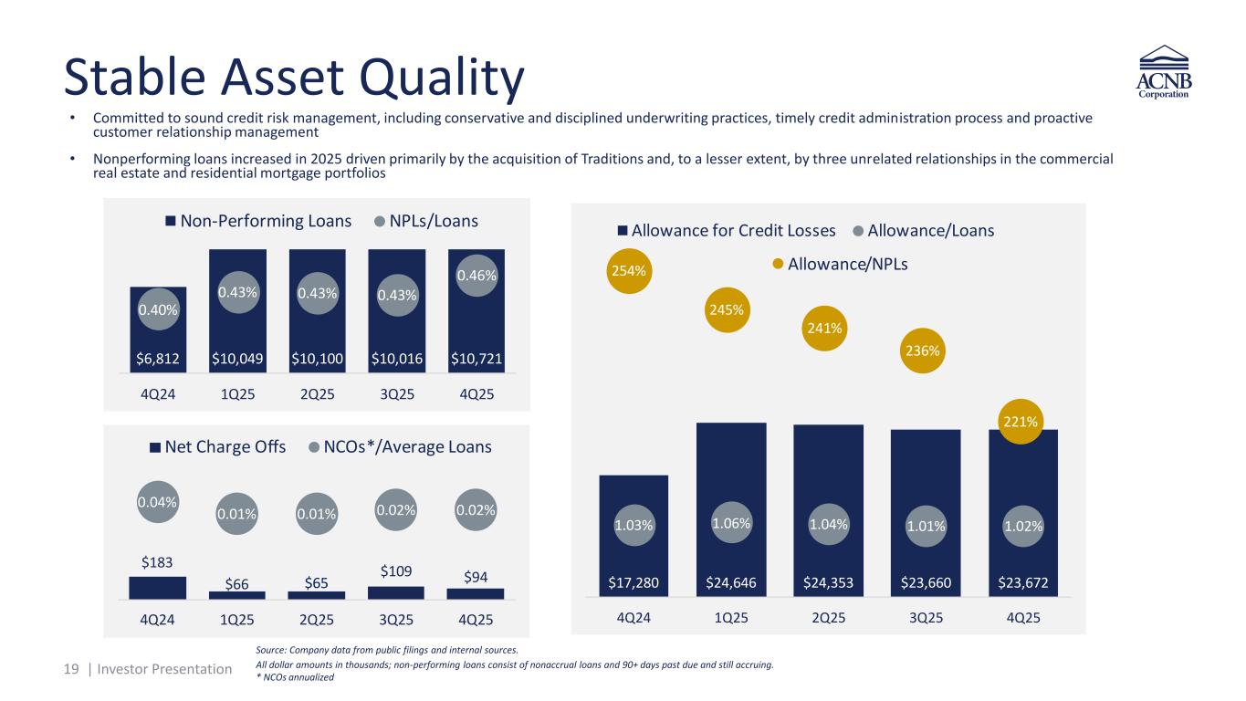 18 | Investor Presentation Double Leverage & Interest Coverage 1) Assumes the net proceeds of the offering are used to refinance outstanding $15 million of fixed-to-floating 2021 notes, with the remainder used for general corporate purposes. 2) Assumes an illustrative 6.00% coupon on new subordinated notes 3) Other borrowing interest expense calculated based off a fixed 4.00% coupon. Note: All offering assumptions are for illustrative purposes only; any redemption of subordinated notes will depend on a number of factors, including market conditions and business developments. See slides 3-4 for more information. Source: Company data from public filings and internal sources. ($ in thousands) Double Leverage Ratio As of the Year Ended: Offering Pro Forma Year Ended 12/31/2021 12/31/2022 12/31/2023 12/31/2024 12/31/2025 Adj.¹ 12/31/2025 Parent Company Investment in Subsidiaries $278,790 $244,563 $278,771 $303,747 $415,508 – $415,508 Parent Company Equity 272,114 245,042 277,461 303,273 419,974 – 419,974 Double Leverage Ratio 102% 100% 100% 100% 99% – 99% Interest Coverage Total Deposit Interest $5,012 $2,561 $3,695 $11,194 $26,699 – $26,699 New Subordinated Notes Interest Expense – – – – – 900² 900 Other Borrowing Interest Expense 1,903 1,063 4,625 12,660 13,423 (600)³ 12,823 Total Interest Expense $6,915 $3,624 $8,320 $23,854 $40,122 $300 $40,422 Pre-Tax Income $35,019 $44,951 $39,849 $40,419 $46,454 ($300) $46,154 Based on Pre-Tax Income Interest Coverage (Inc. Deps. Expense) 6.1x 13.4x 5.8x 2.7x 2.2x – 2.1x Interest Coverage (Ex. Deps. Expense) 19.4x 43.3x 9.6x 4.2x 4.5x – 4.4x