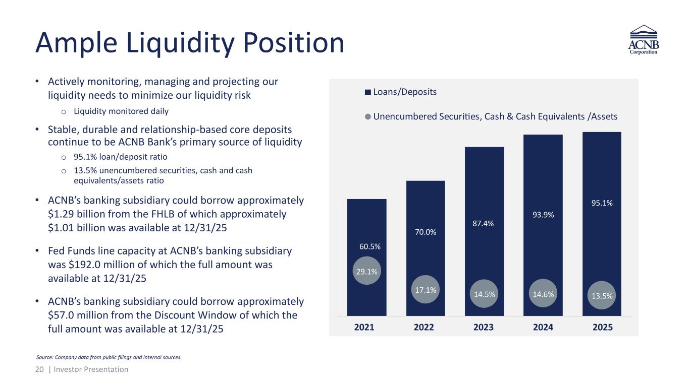 19 | Investor Presentation Stable Asset Quality • Committed to sound credit risk management, including conservative and disciplined underwriting practices, timely credit administration process and proactive customer relationship management • Nonperforming loans increased in 2025 driven primarily by the acquisition of Traditions and, to a lesser extent, by three unrelated relationships in the commercial real estate and residential mortgage portfolios All dollar amounts in thousands; non-performing loans consist of nonaccrual loans and 90+ days past due and still accruing. * NCOs annualized Source: Company data from public filings and internal sources. 6,812 10,049 10,100 10,016 10, 21 0.40% 0.43% 0.43% 0.43% 0.46% 4Q24 1Q25 2Q25 3Q25 4Q25 Non Performing Loans NPLs/Loans 183 66 65 109 94 0.04% 0.01% 0.01% 0.02% 0.02% 4Q24 1Q25 2Q25 3Q25 4Q25 Net Charge s NC s /Average Loans 1 ,280 24,646 24,353 23,660 23,6 2 1.03% 1.06% 1.04% 1.01% 1.02% 4Q24 1Q25 2Q25 3Q25 4Q25 Allowance for Credit Losses Allowance/Loans 254% 245% 241% 236% 221% Allowance/NPLs