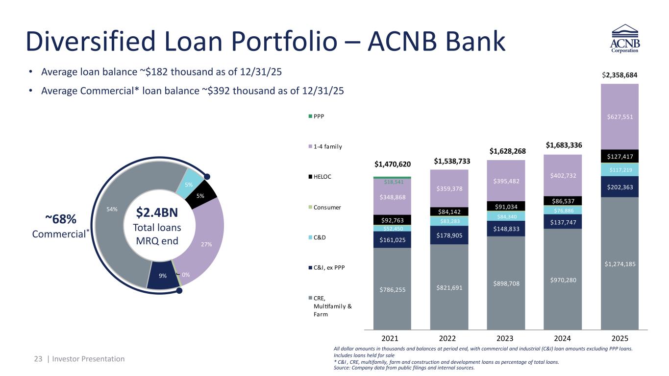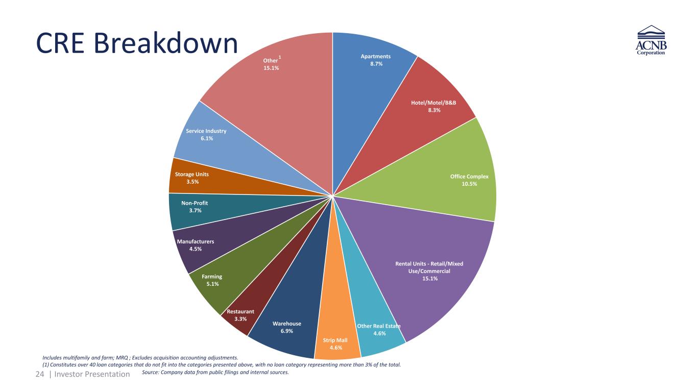 23 | Investor Presentation 9% 54% 5% 5% 2 % 0% 86,255 821,691 898, 08 9 0,280 1,2 4,185 161,025 1 8,905 148,833 13 , 4 202,363 52,450 83,283 84,340 6,886 11 ,219 92, 63 84,142 91,034 86,53 12 ,41 348,868 359,3 8 395,482 402, 32 62 ,551 18,541 PPP 1 4 family L C Consumer C D C I, ex PPP CR , Mul family arm ~68% Commercial* Diversified Loan Portfolio – ACNB Bank • Average loan balance ~$182 thousand as of 12/31/25 • Average Commercial* loan balance ~$392 thousand as of 12/31/25 All dollar amounts in thousands and balances at period end, with commercial and industrial (C&I) loan amounts excluding PPP loans. Includes loans held for sale * C&I , CRE, multifamily, farm and construction and development loans as percentage of total loans. $2.4BN Total loans MRQ end $138,717 Source: Company data from public filings and internal sources. $2,358,684 2021 2022 2023 2024 2025