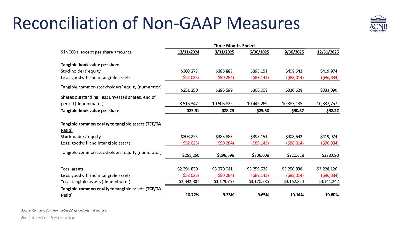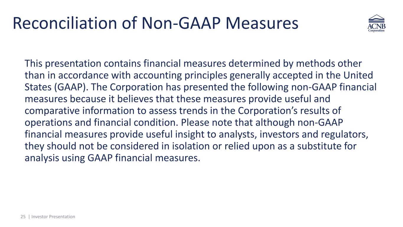 25 | Investor Presentation This presentation contains financial measures determined by methods other than in accordance with accounting principles generally accepted in the United States (GAAP). The Corporation has presented the following non-GAAP financial measures because it believes that these measures provide useful and comparative information to assess trends in the Corporation’s results of operations and financial condition. Please note that although non-GAAP financial measures provide useful insight to analysts, investors and regulators, they should not be considered in isolation or relied upon as a substitute for analysis using GAAP financial measures. Reconciliation of Non-GAAP Measures
