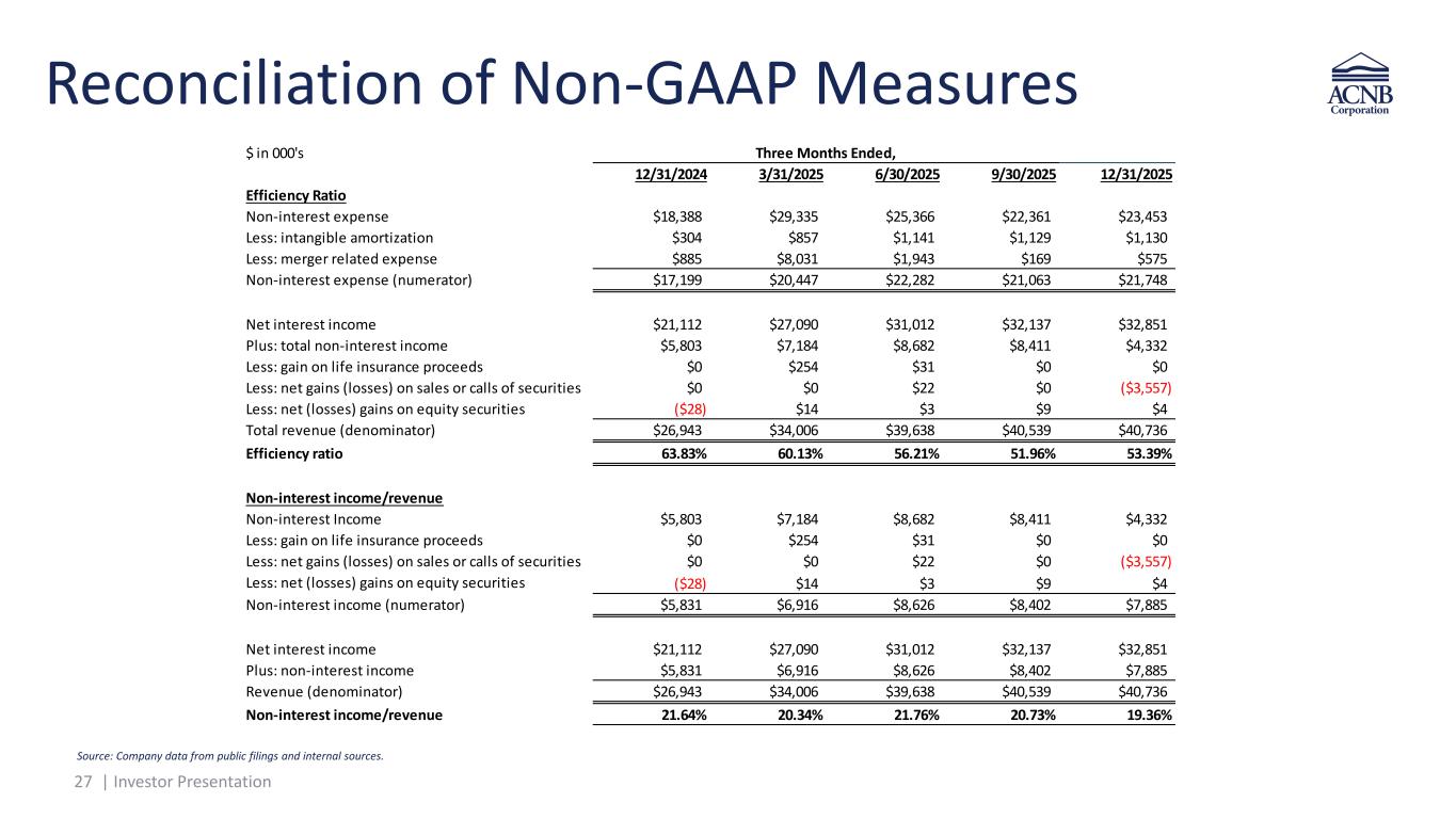 26 | Investor Presentation Reconciliation of Non-GAAP Measures $ in 000's, except per share amounts 12/31/2024 3/31/2025 6/30/2025 9/30/2025 12/31/2025 Tangible book value per share Stockholders' equity $303,273 $386,883 $395,151 $408,642 $419,974 Less: goodwill and intangible assets ($52,023) ($90,284) ($89,143) ($88,014) ($86,884) Tangible common stockholders’ equity (numerator) $251,250 $296,599 $306,008 $320,628 $333,090 Shares outstanding, less unvested shares, end of period (denominator) 8,515,347 10,506,822 10,442,269 10,387,135 10,337,757 Tangible book value per share $29.51 $28.23 $29.30 $30.87 $32.22 Tangible common equity to tangible assets (TCE/TA Ratio) Stockholders' equity $303,273 $386,883 $395,151 $408,642 $419,974 Less: goodwill and intangible assets ($52,023) ($90,284) ($89,143) ($88,014) ($86,884) Tangible common stockholders’ equity (numerator) $251,250 $296,599 $306,008 $320,628 $333,090 Total assets $2,394,830 $3,270,041 $3,259,528 $3,250,838 $3,228,126 Less: goodwill and intangible assets ($52,023) ($90,284) ($89,143) ($88,014) ($86,884) Total tangible assets (denominator) $2,342,807 $3,179,757 $3,170,385 $3,162,824 $3,141,242 Tangible common equity to tangible assets (TCE/TA Ratio) 10.72% 9.33% 9.65% 10.14% 10.60% Three Months Ended, Source: Company data from public filings and internal sources.