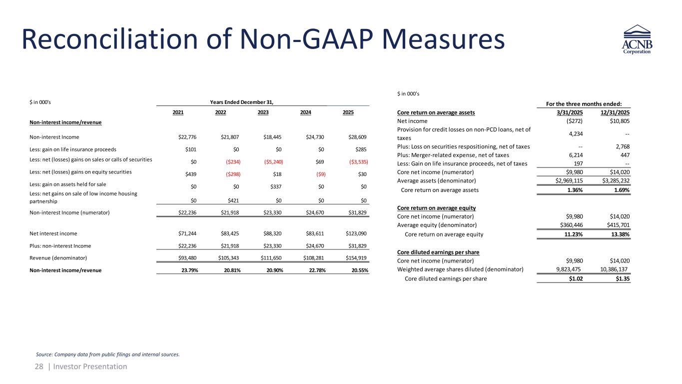 27 | Investor Presentation Reconciliation of Non-GAAP Measures $ in 000's 12/31/2024 3/31/2025 6/30/2025 9/30/2025 12/31/2025 Efficiency Ratio Non-interest expense $18,388 $29,335 $25,366 $22,361 $23,453 Less: intangible amortization $304 $857 $1,141 $1,129 $1,130 Less: merger related expense $885 $8,031 $1,943 $169 $575 Non-interest expense (numerator) $17,199 $20,447 $22,282 $21,063 $21,748 Net interest income $21,112 $27,090 $31,012 $32,137 $32,851 Plus: total non-interest income $5,803 $7,184 $8,682 $8,411 $4,332 Less: gain on life insurance proceeds $0 $254 $31 $0 $0 Less: net gains (losses) on sales or calls of securities $0 $0 $22 $0 ($3,557) Less: net (losses) gains on equity securities ($28) $14 $3 $9 $4 Total revenue (denominator) $26,943 $34,006 $39,638 $40,539 $40,736 Efficiency ratio 63.83% 60.13% 56.21% 51.96% 53.39% Non-interest income/revenue Non-interest Income $5,803 $7,184 $8,682 $8,411 $4,332 Less: gain on life insurance proceeds $0 $254 $31 $0 $0 Less: net gains (losses) on sales or calls of securities $0 $0 $22 $0 ($3,557) Less: net (losses) gains on equity securities ($28) $14 $3 $9 $4 Non-interest income (numerator) $5,831 $6,916 $8,626 $8,402 $7,885 Net interest income $21,112 $27,090 $31,012 $32,137 $32,851 Plus: non-interest income $5,831 $6,916 $8,626 $8,402 $7,885 Revenue (denominator) $26,943 $34,006 $39,638 $40,539 $40,736 Non-interest income/revenue 21.64% 20.34% 21.76% 20.73% 19.36% Three Months Ended, Source: Company data from public filings and internal sources.