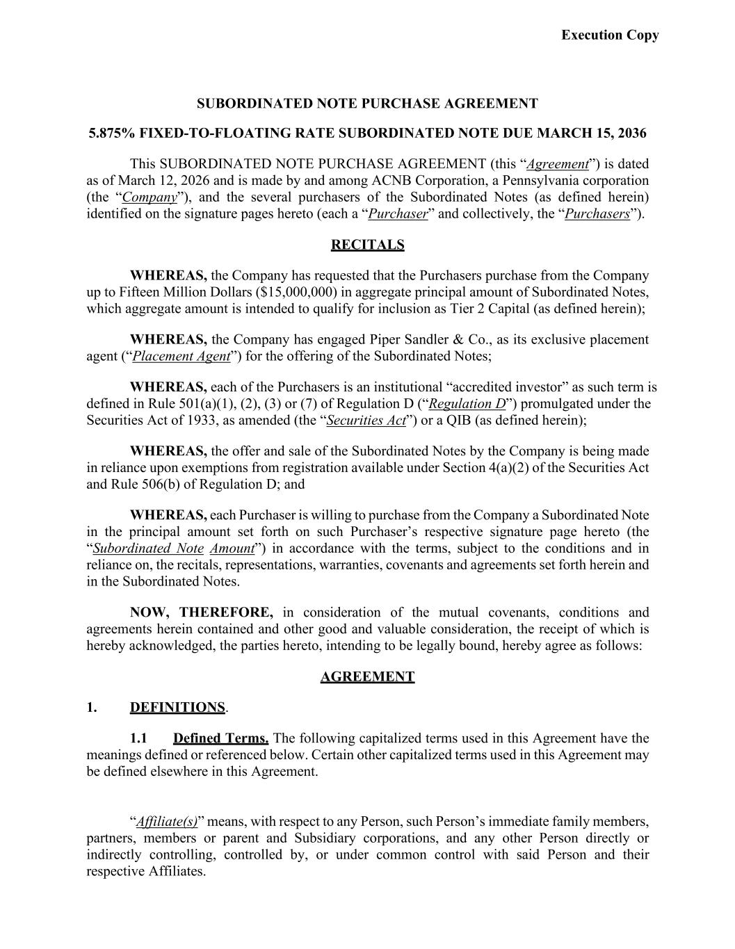 Execution Copy SUBORDINATED NOTE PURCHASE AGREEMENT 5.875% FIXED-TO-FLOATING RATE SUBORDINATED NOTE DUE MARCH 15, 2036 This SUBORDINATED NOTE PURCHASE AGREEMENT (this “Agreement”) is dated as of March 12, 2026 and is made by and among ACNB Corporation, a Pennsylvania corporation (the “Company”), and the several purchasers of the Subordinated Notes (as defined herein) identified on the signature pages hereto (each a “Purchaser” and collectively, the “Purchasers”). RECITALS WHEREAS, the Company has requested that the Purchasers purchase from the Company up to Fifteen Million Dollars ($15,000,000) in aggregate principal amount of Subordinated Notes, which aggregate amount is intended to qualify for inclusion as Tier 2 Capital (as defined herein); WHEREAS, the Company has engaged Piper Sandler & Co., as its exclusive placement agent (“Placement Agent”) for the offering of the Subordinated Notes; WHEREAS, each of the Purchasers is an institutional “accredited investor” as such term is defined in Rule 501(a)(1), (2), (3) or (7) of Regulation D (“Regulation D”) promulgated under the Securities Act of 1933, as amended (the “Securities Act”) or a QIB (as defined herein); WHEREAS, the offer and sale of the Subordinated Notes by the Company is being made in reliance upon exemptions from registration available under Section 4(a)(2) of the Securities Act and Rule 506(b) of Regulation D; and WHEREAS, each Purchaser is willing to purchase from the Company a Subordinated Note in the principal amount set forth on such Purchaser’s respective signature page hereto (the “Subordinated Note Amount”) in accordance with the terms, subject to the conditions and in reliance on, the recitals, representations, warranties, covenants and agreements set forth herein and in the Subordinated Notes. NOW, THEREFORE, in consideration of the mutual covenants, conditions and agreements herein contained and other good and valuable consideration, the receipt of which is hereby acknowledged, the parties hereto, intending to be legally bound, hereby agree as follows: AGREEMENT 1. DEFINITIONS. 1.1 Defined Terms. The following capitalized terms used in this Agreement have the meanings defined or referenced below. Certain other capitalized terms used in this Agreement may be defined elsewhere in this Agreement. “Affiliate(s)” means, with respect to any Person, such Person’s immediate family members, partners, members or parent and Subsidiary corporations, and any other Person directly or indirectly controlling, controlled by, or under common control with said Person and their respective Affiliates.