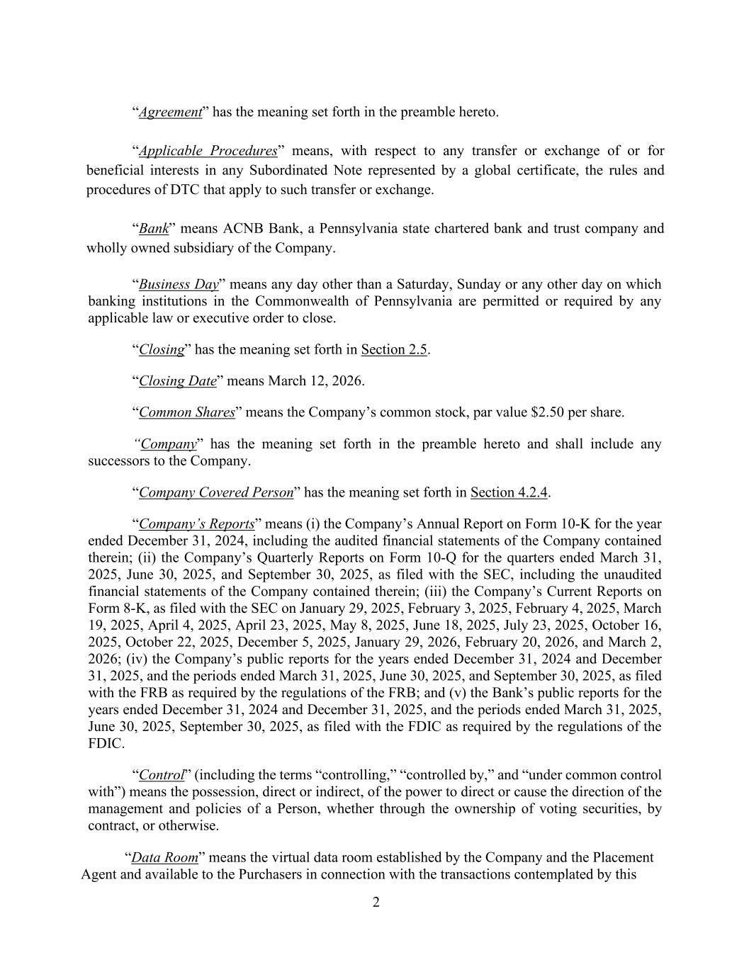 2 “Agreement” has the meaning set forth in the preamble hereto. “Applicable Procedures” means, with respect to any transfer or exchange of or for beneficial interests in any Subordinated Note represented by a global certificate, the rules and procedures of DTC that apply to such transfer or exchange. “Bank” means ACNB Bank, a Pennsylvania state chartered bank and trust company and wholly owned subsidiary of the Company. “Business Day” means any day other than a Saturday, Sunday or any other day on which banking institutions in the Commonwealth of Pennsylvania are permitted or required by any applicable law or executive order to close. “Closing” has the meaning set forth in Section 2.5. “Closing Date” means March 12, 2026. “Common Shares” means the Company’s common stock, par value $2.50 per share. “Company” has the meaning set forth in the preamble hereto and shall include any successors to the Company. “Company Covered Person” has the meaning set forth in Section 4.2.4. “Company’s Reports” means (i) the Company’s Annual Report on Form 10-K for the year ended December 31, 2024, including the audited financial statements of the Company contained therein; (ii) the Company’s Quarterly Reports on Form 10-Q for the quarters ended March 31, 2025, June 30, 2025, and September 30, 2025, as filed with the SEC, including the unaudited financial statements of the Company contained therein; (iii) the Company’s Current Reports on Form 8-K, as filed with the SEC on January 29, 2025, February 3, 2025, February 4, 2025, March 19, 2025, April 4, 2025, April 23, 2025, May 8, 2025, June 18, 2025, July 23, 2025, October 16, 2025, October 22, 2025, December 5, 2025, January 29, 2026, February 20, 2026, and March 2, 2026; (iv) the Company’s public reports for the years ended December 31, 2024 and December 31, 2025, and the periods ended March 31, 2025, June 30, 2025, and September 30, 2025, as filed with the FRB as required by the regulations of the FRB; and (v) the Bank’s public reports for the years ended December 31, 2024 and December 31, 2025, and the periods ended March 31, 2025, June 30, 2025, September 30, 2025, as filed with the FDIC as required by the regulations of the FDIC. “Control” (including the terms “controlling,” “controlled by,” and “under common control with”) means the possession, direct or indirect, of the power to direct or cause the direction of the management and policies of a Person, whether through the ownership of voting securities, by contract, or otherwise. “Data Room” means the virtual data room established by the Company and the Placement Agent and available to the Purchasers in connection with the transactions contemplated by this