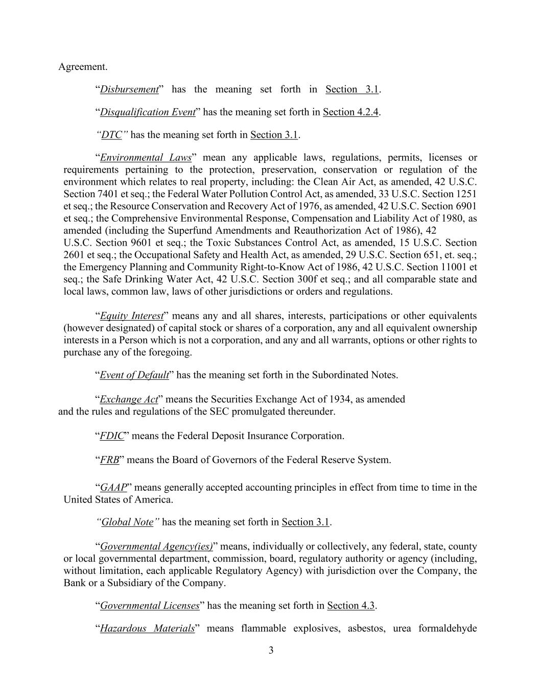 3 Agreement. “Disbursement” has the meaning set forth in Section 3.1. “Disqualification Event” has the meaning set forth in Section 4.2.4. “DTC” has the meaning set forth in Section 3.1. “Environmental Laws” mean any applicable laws, regulations, permits, licenses or requirements pertaining to the protection, preservation, conservation or regulation of the environment which relates to real property, including: the Clean Air Act, as amended, 42 U.S.C. Section 7401 et seq.; the Federal Water Pollution Control Act, as amended, 33 U.S.C. Section 1251 et seq.; the Resource Conservation and Recovery Act of 1976, as amended, 42 U.S.C. Section 6901 et seq.; the Comprehensive Environmental Response, Compensation and Liability Act of 1980, as amended (including the Superfund Amendments and Reauthorization Act of 1986), 42 U.S.C. Section 9601 et seq.; the Toxic Substances Control Act, as amended, 15 U.S.C. Section 2601 et seq.; the Occupational Safety and Health Act, as amended, 29 U.S.C. Section 651, et. seq.; the Emergency Planning and Community Right-to-Know Act of 1986, 42 U.S.C. Section 11001 et seq.; the Safe Drinking Water Act, 42 U.S.C. Section 300f et seq.; and all comparable state and local laws, common law, laws of other jurisdictions or orders and regulations. “Equity Interest” means any and all shares, interests, participations or other equivalents (however designated) of capital stock or shares of a corporation, any and all equivalent ownership interests in a Person which is not a corporation, and any and all warrants, options or other rights to purchase any of the foregoing. “Event of Default” has the meaning set forth in the Subordinated Notes. “Exchange Act” means the Securities Exchange Act of 1934, as amended and the rules and regulations of the SEC promulgated thereunder. “FDIC” means the Federal Deposit Insurance Corporation. “FRB” means the Board of Governors of the Federal Reserve System. “GAAP” means generally accepted accounting principles in effect from time to time in the United States of America. “Global Note” has the meaning set forth in Section 3.1. “Governmental Agency(ies)” means, individually or collectively, any federal, state, county or local governmental department, commission, board, regulatory authority or agency (including, without limitation, each applicable Regulatory Agency) with jurisdiction over the Company, the Bank or a Subsidiary of the Company. “Governmental Licenses” has the meaning set forth in Section 4.3. “Hazardous Materials” means flammable explosives, asbestos, urea formaldehyde