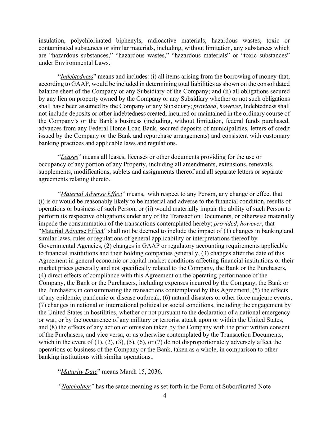 4 insulation, polychlorinated biphenyls, radioactive materials, hazardous wastes, toxic or contaminated substances or similar materials, including, without limitation, any substances which are “hazardous substances,” “hazardous wastes,” “hazardous materials” or “toxic substances” under Environmental Laws. “Indebtedness” means and includes: (i) all items arising from the borrowing of money that, according to GAAP, would be included in determining total liabilities as shown on the consolidated balance sheet of the Company or any Subsidiary of the Company; and (ii) all obligations secured by any lien on property owned by the Company or any Subsidiary whether or not such obligations shall have been assumed by the Company or any Subsidiary; provided, however, Indebtedness shall not include deposits or other indebtedness created, incurred or maintained in the ordinary course of the Company’s or the Bank’s business (including, without limitation, federal funds purchased, advances from any Federal Home Loan Bank, secured deposits of municipalities, letters of credit issued by the Company or the Bank and repurchase arrangements) and consistent with customary banking practices and applicable laws and regulations. “Leases” means all leases, licenses or other documents providing for the use or occupancy of any portion of any Property, including all amendments, extensions, renewals, supplements, modifications, sublets and assignments thereof and all separate letters or separate agreements relating thereto. “Material Adverse Effect” means, with respect to any Person, any change or effect that (i) is or would be reasonably likely to be material and adverse to the financial condition, results of operations or business of such Person, or (ii) would materially impair the ability of such Person to perform its respective obligations under any of the Transaction Documents, or otherwise materially impede the consummation of the transactions contemplated hereby; provided, however, that “Material Adverse Effect” shall not be deemed to include the impact of (1) changes in banking and similar laws, rules or regulations of general applicability or interpretations thereof by Governmental Agencies, (2) changes in GAAP or regulatory accounting requirements applicable to financial institutions and their holding companies generally, (3) changes after the date of this Agreement in general economic or capital market conditions affecting financial institutions or their market prices generally and not specifically related to the Company, the Bank or the Purchasers, (4) direct effects of compliance with this Agreement on the operating performance of the Company, the Bank or the Purchasers, including expenses incurred by the Company, the Bank or the Purchasers in consummating the transactions contemplated by this Agreement, (5) the effects of any epidemic, pandemic or disease outbreak, (6) natural disasters or other force majeure events, (7) changes in national or international political or social conditions, including the engagement by the United States in hostilities, whether or not pursuant to the declaration of a national emergency or war, or by the occurrence of any military or terrorist attack upon or within the United States, and (8) the effects of any action or omission taken by the Company with the prior written consent of the Purchasers, and vice versa, or as otherwise contemplated by the Transaction Documents, which in the event of (1), (2), (3), (5), (6), or (7) do not disproportionately adversely affect the operations or business of the Company or the Bank, taken as a whole, in comparison to other banking institutions with similar operations.. “Maturity Date” means March 15, 2036. “Noteholder” has the same meaning as set forth in the Form of Subordinated Note