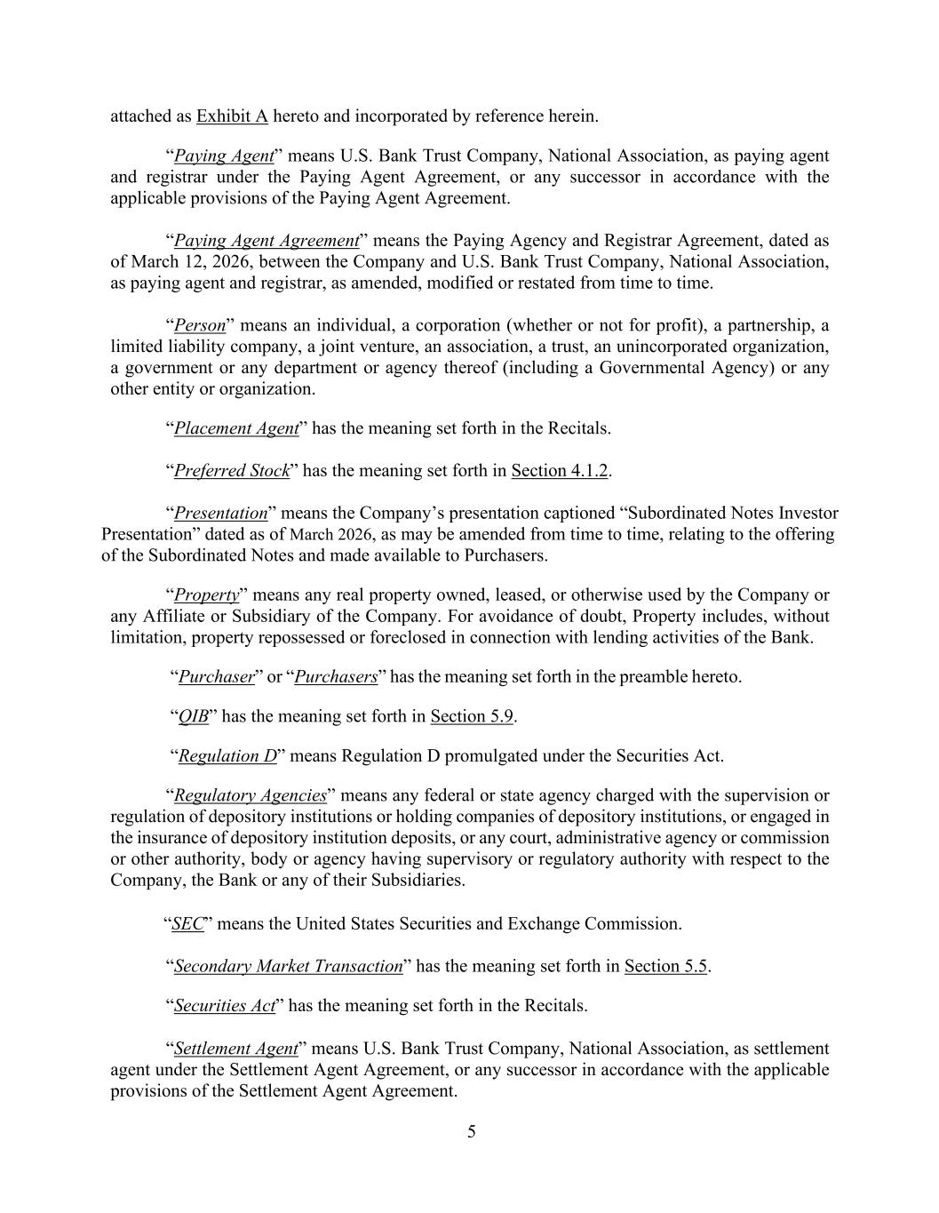 5 attached as Exhibit A hereto and incorporated by reference herein. “Paying Agent” means U.S. Bank Trust Company, National Association, as paying agent and registrar under the Paying Agent Agreement, or any successor in accordance with the applicable provisions of the Paying Agent Agreement. “Paying Agent Agreement” means the Paying Agency and Registrar Agreement, dated as of March 12, 2026, between the Company and U.S. Bank Trust Company, National Association, as paying agent and registrar, as amended, modified or restated from time to time. “Person” means an individual, a corporation (whether or not for profit), a partnership, a limited liability company, a joint venture, an association, a trust, an unincorporated organization, a government or any department or agency thereof (including a Governmental Agency) or any other entity or organization. “Placement Agent” has the meaning set forth in the Recitals. “Preferred Stock” has the meaning set forth in Section 4.1.2. “Presentation” means the Company’s presentation captioned “Subordinated Notes Investor Presentation” dated as of March 2026, as may be amended from time to time, relating to the offering of the Subordinated Notes and made available to Purchasers. “Property” means any real property owned, leased, or otherwise used by the Company or any Affiliate or Subsidiary of the Company. For avoidance of doubt, Property includes, without limitation, property repossessed or foreclosed in connection with lending activities of the Bank. “Purchaser” or “Purchasers” has the meaning set forth in the preamble hereto. “QIB” has the meaning set forth in Section 5.9. “Regulation D” means Regulation D promulgated under the Securities Act. “Regulatory Agencies” means any federal or state agency charged with the supervision or regulation of depository institutions or holding companies of depository institutions, or engaged in the insurance of depository institution deposits, or any court, administrative agency or commission or other authority, body or agency having supervisory or regulatory authority with respect to the Company, the Bank or any of their Subsidiaries. “SEC” means the United States Securities and Exchange Commission. “Secondary Market Transaction” has the meaning set forth in Section 5.5. “Securities Act” has the meaning set forth in the Recitals. “Settlement Agent” means U.S. Bank Trust Company, National Association, as settlement agent under the Settlement Agent Agreement, or any successor in accordance with the applicable provisions of the Settlement Agent Agreement.