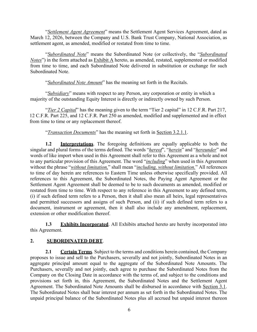 6 “Settlement Agent Agreement” means the Settlement Agent Services Agreement, dated as March 12, 2026, between the Company and U.S. Bank Trust Company, National Association, as settlement agent, as amended, modified or restated from time to time. “Subordinated Note” means the Subordinated Note (or collectively, the “Subordinated Notes”) in the form attached as Exhibit A hereto, as amended, restated, supplemented or modified from time to time, and each Subordinated Note delivered in substitution or exchange for such Subordinated Note. “Subordinated Note Amount” has the meaning set forth in the Recitals. “Subsidiary” means with respect to any Person, any corporation or entity in which a majority of the outstanding Equity Interest is directly or indirectly owned by such Person. “Tier 2 Capital” has the meaning given to the term “Tier 2 capital” in 12 C.F.R. Part 217, 12 C.F.R. Part 225, and 12 C.F.R. Part 250 as amended, modified and supplemented and in effect from time to time or any replacement thereof. “Transaction Documents” has the meaning set forth in Section 3.2.1.1. 1.2 Interpretations. The foregoing definitions are equally applicable to both the singular and plural forms of the terms defined. The words “hereof”, “herein” and “hereunder” and words of like import when used in this Agreement shall refer to this Agreement as a whole and not to any particular provision of this Agreement. The word “including” when used in this Agreement without the phrase “without limitation,” shall mean “including, without limitation.” All references to time of day herein are references to Eastern Time unless otherwise specifically provided. All references to this Agreement, the Subordinated Notes, the Paying Agent Agreement or the Settlement Agent Agreement shall be deemed to be to such documents as amended, modified or restated from time to time. With respect to any reference in this Agreement to any defined term, (i) if such defined term refers to a Person, then it shall also mean all heirs, legal representatives and permitted successors and assigns of such Person, and (ii) if such defined term refers to a document, instrument or agreement, then it shall also include any amendment, replacement, extension or other modification thereof. 1.3 Exhibits Incorporated. All Exhibits attached hereto are hereby incorporated into this Agreement. 2. SUBORDINATED DEBT. 2.1 Certain Terms. Subject to the terms and conditions herein contained, the Company proposes to issue and sell to the Purchasers, severally and not jointly, Subordinated Notes in an aggregate principal amount equal to the aggregate of the Subordinated Note Amounts. The Purchasers, severally and not jointly, each agree to purchase the Subordinated Notes from the Company on the Closing Date in accordance with the terms of, and subject to the conditions and provisions set forth in, this Agreement, the Subordinated Notes and the Settlement Agent Agreement. The Subordinated Note Amounts shall be disbursed in accordance with Section 3.1. The Subordinated Notes shall bear interest per annum as set forth in the Subordinated Notes. The unpaid principal balance of the Subordinated Notes plus all accrued but unpaid interest thereon