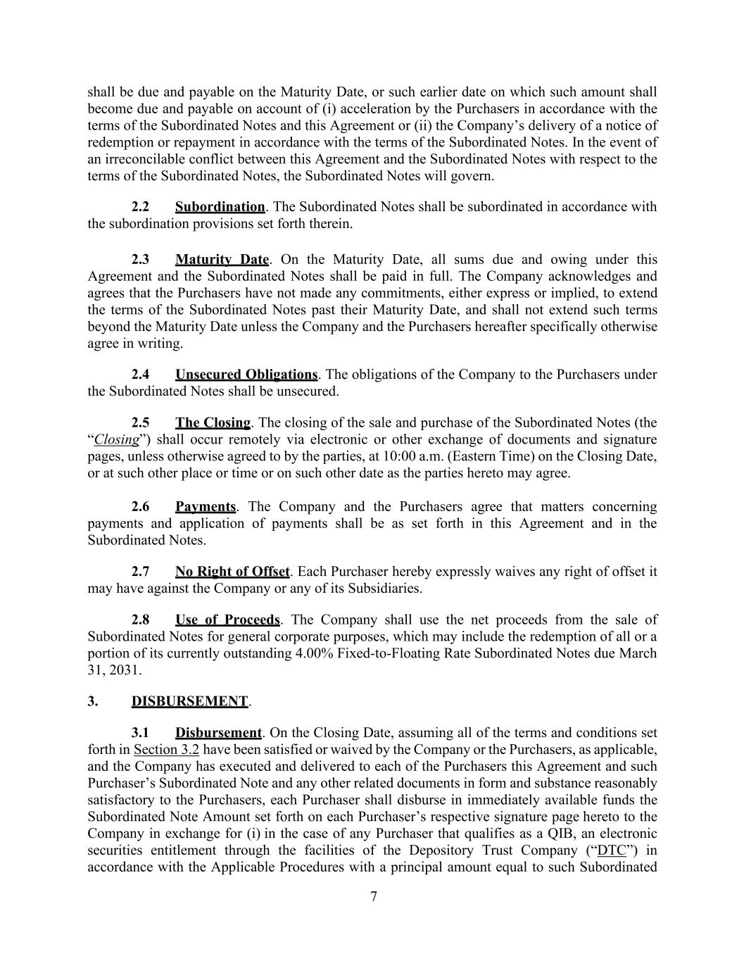 7 shall be due and payable on the Maturity Date, or such earlier date on which such amount shall become due and payable on account of (i) acceleration by the Purchasers in accordance with the terms of the Subordinated Notes and this Agreement or (ii) the Company’s delivery of a notice of redemption or repayment in accordance with the terms of the Subordinated Notes. In the event of an irreconcilable conflict between this Agreement and the Subordinated Notes with respect to the terms of the Subordinated Notes, the Subordinated Notes will govern. 2.2 Subordination. The Subordinated Notes shall be subordinated in accordance with the subordination provisions set forth therein. 2.3 Maturity Date. On the Maturity Date, all sums due and owing under this Agreement and the Subordinated Notes shall be paid in full. The Company acknowledges and agrees that the Purchasers have not made any commitments, either express or implied, to extend the terms of the Subordinated Notes past their Maturity Date, and shall not extend such terms beyond the Maturity Date unless the Company and the Purchasers hereafter specifically otherwise agree in writing. 2.4 Unsecured Obligations. The obligations of the Company to the Purchasers under the Subordinated Notes shall be unsecured. 2.5 The Closing. The closing of the sale and purchase of the Subordinated Notes (the “Closing”) shall occur remotely via electronic or other exchange of documents and signature pages, unless otherwise agreed to by the parties, at 10:00 a.m. (Eastern Time) on the Closing Date, or at such other place or time or on such other date as the parties hereto may agree. 2.6 Payments. The Company and the Purchasers agree that matters concerning payments and application of payments shall be as set forth in this Agreement and in the Subordinated Notes. 2.7 No Right of Offset. Each Purchaser hereby expressly waives any right of offset it may have against the Company or any of its Subsidiaries. 2.8 Use of Proceeds. The Company shall use the net proceeds from the sale of Subordinated Notes for general corporate purposes, which may include the redemption of all or a portion of its currently outstanding 4.00% Fixed-to-Floating Rate Subordinated Notes due March 31, 2031. 3. DISBURSEMENT. 3.1 Disbursement. On the Closing Date, assuming all of the terms and conditions set forth in Section 3.2 have been satisfied or waived by the Company or the Purchasers, as applicable, and the Company has executed and delivered to each of the Purchasers this Agreement and such Purchaser’s Subordinated Note and any other related documents in form and substance reasonably satisfactory to the Purchasers, each Purchaser shall disburse in immediately available funds the Subordinated Note Amount set forth on each Purchaser’s respective signature page hereto to the Company in exchange for (i) in the case of any Purchaser that qualifies as a QIB, an electronic securities entitlement through the facilities of the Depository Trust Company (“DTC”) in accordance with the Applicable Procedures with a principal amount equal to such Subordinated