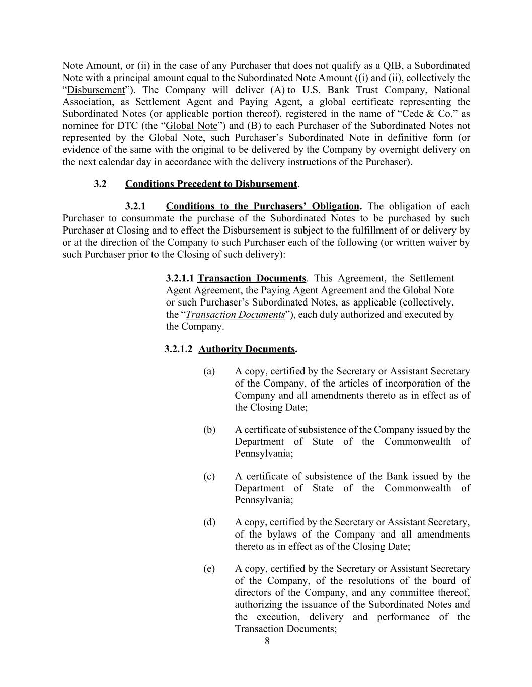 8 Note Amount, or (ii) in the case of any Purchaser that does not qualify as a QIB, a Subordinated Note with a principal amount equal to the Subordinated Note Amount ((i) and (ii), collectively the “Disbursement”). The Company will deliver (A) to U.S. Bank Trust Company, National Association, as Settlement Agent and Paying Agent, a global certificate representing the Subordinated Notes (or applicable portion thereof), registered in the name of “Cede & Co.” as nominee for DTC (the “Global Note”) and (B) to each Purchaser of the Subordinated Notes not represented by the Global Note, such Purchaser’s Subordinated Note in definitive form (or evidence of the same with the original to be delivered by the Company by overnight delivery on the next calendar day in accordance with the delivery instructions of the Purchaser). 3.2 Conditions Precedent to Disbursement. 3.2.1 Conditions to the Purchasers’ Obligation. The obligation of each Purchaser to consummate the purchase of the Subordinated Notes to be purchased by such Purchaser at Closing and to effect the Disbursement is subject to the fulfillment of or delivery by or at the direction of the Company to such Purchaser each of the following (or written waiver by such Purchaser prior to the Closing of such delivery): 3.2.1.1 Transaction Documents. This Agreement, the Settlement Agent Agreement, the Paying Agent Agreement and the Global Note or such Purchaser’s Subordinated Notes, as applicable (collectively, the “Transaction Documents”), each duly authorized and executed by the Company. 3.2.1.2 Authority Documents. (a) A copy, certified by the Secretary or Assistant Secretary of the Company, of the articles of incorporation of the Company and all amendments thereto as in effect as of the Closing Date; (b) A certificate of subsistence of the Company issued by the Department of State of the Commonwealth of Pennsylvania; (c) A certificate of subsistence of the Bank issued by the Department of State of the Commonwealth of Pennsylvania; (d) A copy, certified by the Secretary or Assistant Secretary, of the bylaws of the Company and all amendments thereto as in effect as of the Closing Date; (e) A copy, certified by the Secretary or Assistant Secretary of the Company, of the resolutions of the board of directors of the Company, and any committee thereof, authorizing the issuance of the Subordinated Notes and the execution, delivery and performance of the Transaction Documents;