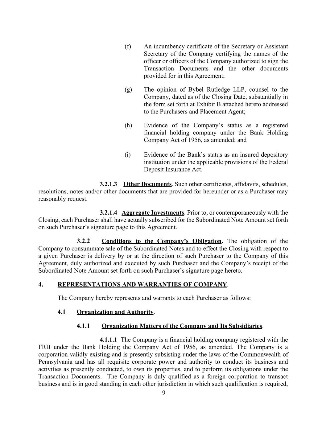 9 (f) An incumbency certificate of the Secretary or Assistant Secretary of the Company certifying the names of the officer or officers of the Company authorized to sign the Transaction Documents and the other documents provided for in this Agreement; (g) The opinion of Bybel Rutledge LLP, counsel to the Company, dated as of the Closing Date, substantially in the form set forth at Exhibit B attached hereto addressed to the Purchasers and Placement Agent; (h) Evidence of the Company’s status as a registered financial holding company under the Bank Holding Company Act of 1956, as amended; and (i) Evidence of the Bank’s status as an insured depository institution under the applicable provisions of the Federal Deposit Insurance Act. 3.2.1.3 Other Documents. Such other certificates, affidavits, schedules, resolutions, notes and/or other documents that are provided for hereunder or as a Purchaser may reasonably request. 3.2.1.4 Aggregate Investments. Prior to, or contemporaneously with the Closing, each Purchaser shall have actually subscribed for the Subordinated Note Amount set forth on such Purchaser’s signature page to this Agreement. 3.2.2 Conditions to the Company’s Obligation. The obligation of the Company to consummate sale of the Subordinated Notes and to effect the Closing with respect to a given Purchaser is delivery by or at the direction of such Purchaser to the Company of this Agreement, duly authorized and executed by such Purchaser and the Company’s receipt of the Subordinated Note Amount set forth on such Purchaser’s signature page hereto. 4. REPRESENTATIONS AND WARRANTIES OF COMPANY. The Company hereby represents and warrants to each Purchaser as follows: 4.1 Organization and Authority. 4.1.1 Organization Matters of the Company and Its Subsidiaries. 4.1.1.1 The Company is a financial holding company registered with the FRB under the Bank Holding the Company Act of 1956, as amended. The Company is a corporation validly existing and is presently subsisting under the laws of the Commonwealth of Pennsylvania and has all requisite corporate power and authority to conduct its business and activities as presently conducted, to own its properties, and to perform its obligations under the Transaction Documents. The Company is duly qualified as a foreign corporation to transact business and is in good standing in each other jurisdiction in which such qualification is required,