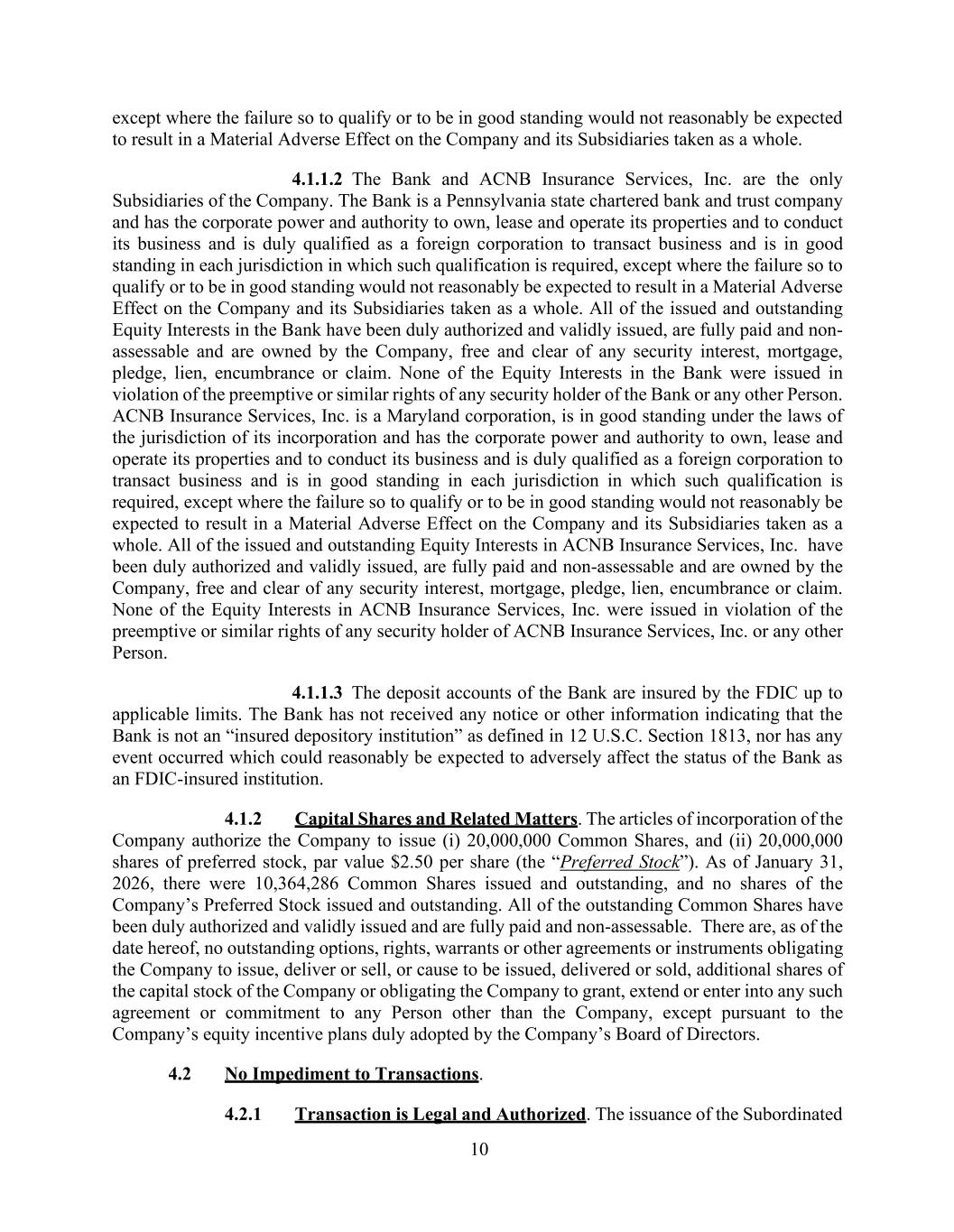 10 except where the failure so to qualify or to be in good standing would not reasonably be expected to result in a Material Adverse Effect on the Company and its Subsidiaries taken as a whole. 4.1.1.2 The Bank and ACNB Insurance Services, Inc. are the only Subsidiaries of the Company. The Bank is a Pennsylvania state chartered bank and trust company and has the corporate power and authority to own, lease and operate its properties and to conduct its business and is duly qualified as a foreign corporation to transact business and is in good standing in each jurisdiction in which such qualification is required, except where the failure so to qualify or to be in good standing would not reasonably be expected to result in a Material Adverse Effect on the Company and its Subsidiaries taken as a whole. All of the issued and outstanding Equity Interests in the Bank have been duly authorized and validly issued, are fully paid and non- assessable and are owned by the Company, free and clear of any security interest, mortgage, pledge, lien, encumbrance or claim. None of the Equity Interests in the Bank were issued in violation of the preemptive or similar rights of any security holder of the Bank or any other Person. ACNB Insurance Services, Inc. is a Maryland corporation, is in good standing under the laws of the jurisdiction of its incorporation and has the corporate power and authority to own, lease and operate its properties and to conduct its business and is duly qualified as a foreign corporation to transact business and is in good standing in each jurisdiction in which such qualification is required, except where the failure so to qualify or to be in good standing would not reasonably be expected to result in a Material Adverse Effect on the Company and its Subsidiaries taken as a whole. All of the issued and outstanding Equity Interests in ACNB Insurance Services, Inc. have been duly authorized and validly issued, are fully paid and non-assessable and are owned by the Company, free and clear of any security interest, mortgage, pledge, lien, encumbrance or claim. None of the Equity Interests in ACNB Insurance Services, Inc. were issued in violation of the preemptive or similar rights of any security holder of ACNB Insurance Services, Inc. or any other Person. 4.1.1.3 The deposit accounts of the Bank are insured by the FDIC up to applicable limits. The Bank has not received any notice or other information indicating that the Bank is not an “insured depository institution” as defined in 12 U.S.C. Section 1813, nor has any event occurred which could reasonably be expected to adversely affect the status of the Bank as an FDIC-insured institution. 4.1.2 Capital Shares and Related Matters. The articles of incorporation of the Company authorize the Company to issue (i) 20,000,000 Common Shares, and (ii) 20,000,000 shares of preferred stock, par value $2.50 per share (the “Preferred Stock”). As of January 31, 2026, there were 10,364,286 Common Shares issued and outstanding, and no shares of the Company’s Preferred Stock issued and outstanding. All of the outstanding Common Shares have been duly authorized and validly issued and are fully paid and non-assessable. There are, as of the date hereof, no outstanding options, rights, warrants or other agreements or instruments obligating the Company to issue, deliver or sell, or cause to be issued, delivered or sold, additional shares of the capital stock of the Company or obligating the Company to grant, extend or enter into any such agreement or commitment to any Person other than the Company, except pursuant to the Company’s equity incentive plans duly adopted by the Company’s Board of Directors. 4.2 No Impediment to Transactions. 4.2.1 Transaction is Legal and Authorized. The issuance of the Subordinated