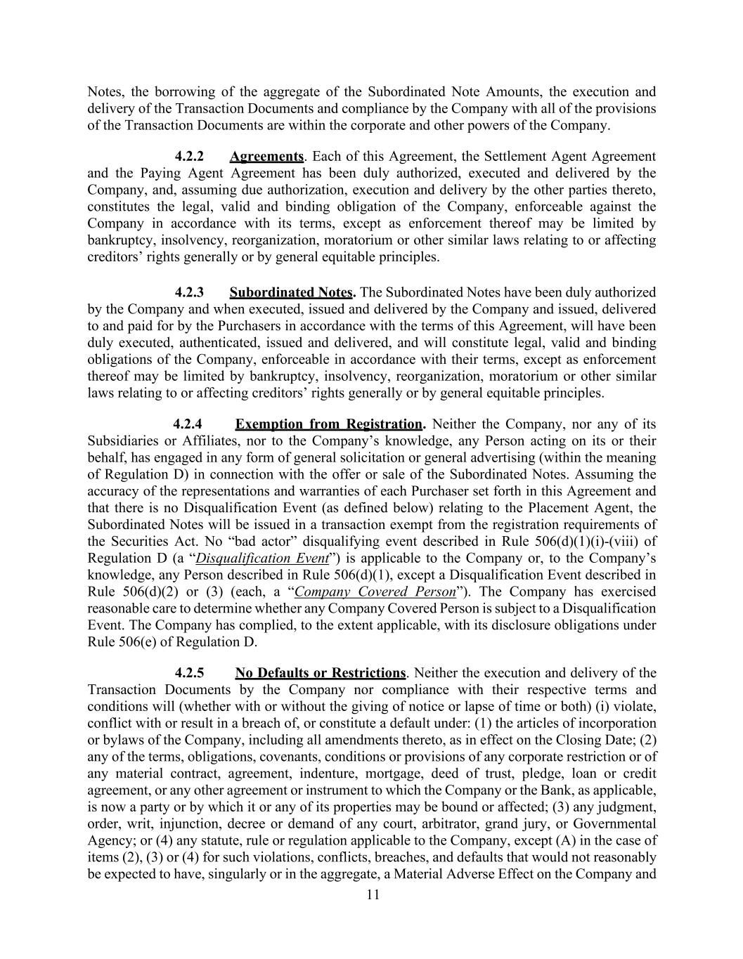 11 Notes, the borrowing of the aggregate of the Subordinated Note Amounts, the execution and delivery of the Transaction Documents and compliance by the Company with all of the provisions of the Transaction Documents are within the corporate and other powers of the Company. 4.2.2 Agreements. Each of this Agreement, the Settlement Agent Agreement and the Paying Agent Agreement has been duly authorized, executed and delivered by the Company, and, assuming due authorization, execution and delivery by the other parties thereto, constitutes the legal, valid and binding obligation of the Company, enforceable against the Company in accordance with its terms, except as enforcement thereof may be limited by bankruptcy, insolvency, reorganization, moratorium or other similar laws relating to or affecting creditors’ rights generally or by general equitable principles. 4.2.3 Subordinated Notes. The Subordinated Notes have been duly authorized by the Company and when executed, issued and delivered by the Company and issued, delivered to and paid for by the Purchasers in accordance with the terms of this Agreement, will have been duly executed, authenticated, issued and delivered, and will constitute legal, valid and binding obligations of the Company, enforceable in accordance with their terms, except as enforcement thereof may be limited by bankruptcy, insolvency, reorganization, moratorium or other similar laws relating to or affecting creditors’ rights generally or by general equitable principles. 4.2.4 Exemption from Registration. Neither the Company, nor any of its Subsidiaries or Affiliates, nor to the Company’s knowledge, any Person acting on its or their behalf, has engaged in any form of general solicitation or general advertising (within the meaning of Regulation D) in connection with the offer or sale of the Subordinated Notes. Assuming the accuracy of the representations and warranties of each Purchaser set forth in this Agreement and that there is no Disqualification Event (as defined below) relating to the Placement Agent, the Subordinated Notes will be issued in a transaction exempt from the registration requirements of the Securities Act. No “bad actor” disqualifying event described in Rule 506(d)(1)(i)-(viii) of Regulation D (a “Disqualification Event”) is applicable to the Company or, to the Company’s knowledge, any Person described in Rule 506(d)(1), except a Disqualification Event described in Rule 506(d)(2) or (3) (each, a “Company Covered Person”). The Company has exercised reasonable care to determine whether any Company Covered Person is subject to a Disqualification Event. The Company has complied, to the extent applicable, with its disclosure obligations under Rule 506(e) of Regulation D. 4.2.5 No Defaults or Restrictions. Neither the execution and delivery of the Transaction Documents by the Company nor compliance with their respective terms and conditions will (whether with or without the giving of notice or lapse of time or both) (i) violate, conflict with or result in a breach of, or constitute a default under: (1) the articles of incorporation or bylaws of the Company, including all amendments thereto, as in effect on the Closing Date; (2) any of the terms, obligations, covenants, conditions or provisions of any corporate restriction or of any material contract, agreement, indenture, mortgage, deed of trust, pledge, loan or credit agreement, or any other agreement or instrument to which the Company or the Bank, as applicable, is now a party or by which it or any of its properties may be bound or affected; (3) any judgment, order, writ, injunction, decree or demand of any court, arbitrator, grand jury, or Governmental Agency; or (4) any statute, rule or regulation applicable to the Company, except (A) in the case of items (2), (3) or (4) for such violations, conflicts, breaches, and defaults that would not reasonably be expected to have, singularly or in the aggregate, a Material Adverse Effect on the Company and