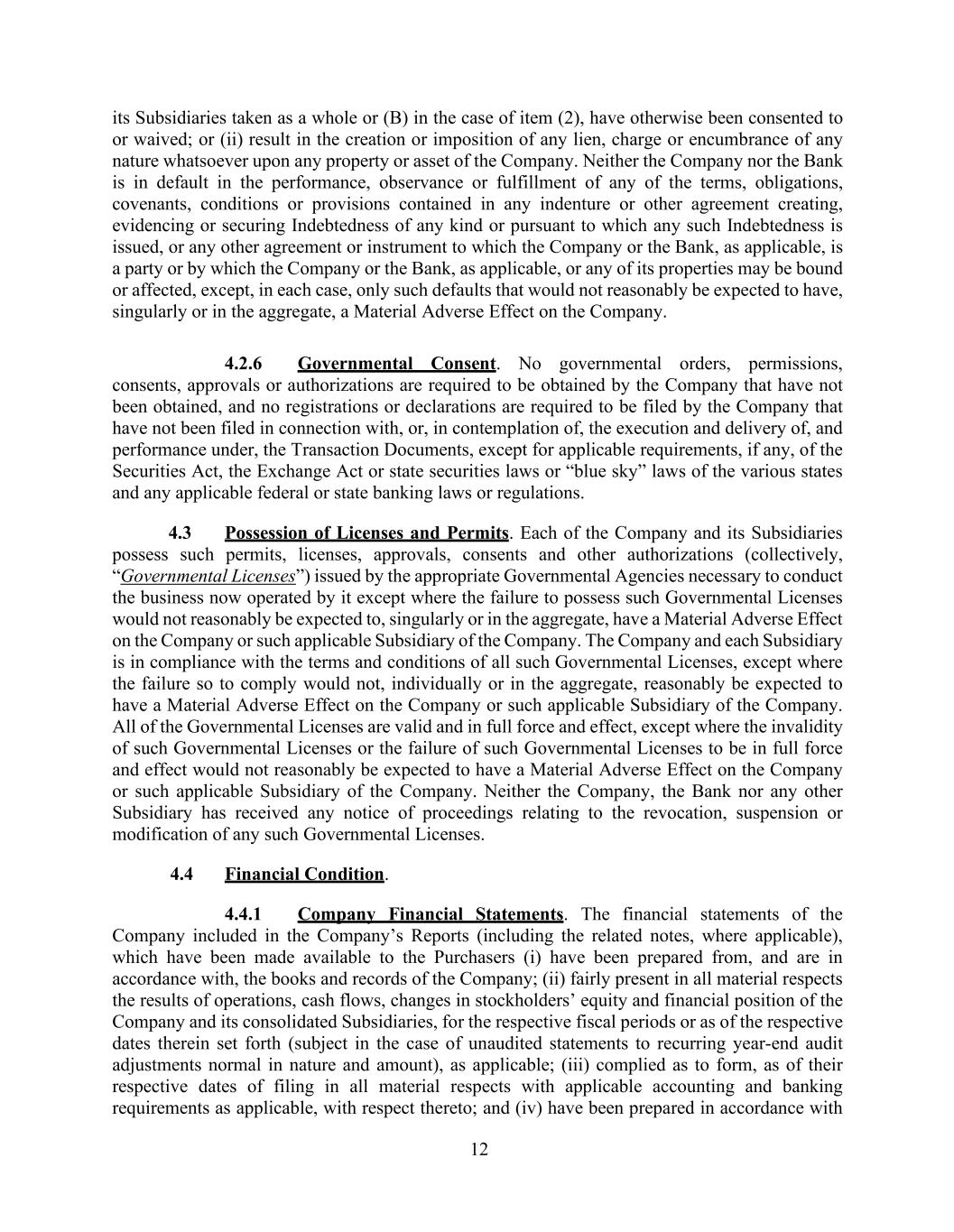 12 its Subsidiaries taken as a whole or (B) in the case of item (2), have otherwise been consented to or waived; or (ii) result in the creation or imposition of any lien, charge or encumbrance of any nature whatsoever upon any property or asset of the Company. Neither the Company nor the Bank is in default in the performance, observance or fulfillment of any of the terms, obligations, covenants, conditions or provisions contained in any indenture or other agreement creating, evidencing or securing Indebtedness of any kind or pursuant to which any such Indebtedness is issued, or any other agreement or instrument to which the Company or the Bank, as applicable, is a party or by which the Company or the Bank, as applicable, or any of its properties may be bound or affected, except, in each case, only such defaults that would not reasonably be expected to have, singularly or in the aggregate, a Material Adverse Effect on the Company. 4.2.6 Governmental Consent. No governmental orders, permissions, consents, approvals or authorizations are required to be obtained by the Company that have not been obtained, and no registrations or declarations are required to be filed by the Company that have not been filed in connection with, or, in contemplation of, the execution and delivery of, and performance under, the Transaction Documents, except for applicable requirements, if any, of the Securities Act, the Exchange Act or state securities laws or “blue sky” laws of the various states and any applicable federal or state banking laws or regulations. 4.3 Possession of Licenses and Permits. Each of the Company and its Subsidiaries possess such permits, licenses, approvals, consents and other authorizations (collectively, “Governmental Licenses”) issued by the appropriate Governmental Agencies necessary to conduct the business now operated by it except where the failure to possess such Governmental Licenses would not reasonably be expected to, singularly or in the aggregate, have a Material Adverse Effect on the Company or such applicable Subsidiary of the Company. The Company and each Subsidiary is in compliance with the terms and conditions of all such Governmental Licenses, except where the failure so to comply would not, individually or in the aggregate, reasonably be expected to have a Material Adverse Effect on the Company or such applicable Subsidiary of the Company. All of the Governmental Licenses are valid and in full force and effect, except where the invalidity of such Governmental Licenses or the failure of such Governmental Licenses to be in full force and effect would not reasonably be expected to have a Material Adverse Effect on the Company or such applicable Subsidiary of the Company. Neither the Company, the Bank nor any other Subsidiary has received any notice of proceedings relating to the revocation, suspension or modification of any such Governmental Licenses. 4.4 Financial Condition. 4.4.1 Company Financial Statements. The financial statements of the Company included in the Company’s Reports (including the related notes, where applicable), which have been made available to the Purchasers (i) have been prepared from, and are in accordance with, the books and records of the Company; (ii) fairly present in all material respects the results of operations, cash flows, changes in stockholders’ equity and financial position of the Company and its consolidated Subsidiaries, for the respective fiscal periods or as of the respective dates therein set forth (subject in the case of unaudited statements to recurring year-end audit adjustments normal in nature and amount), as applicable; (iii) complied as to form, as of their respective dates of filing in all material respects with applicable accounting and banking requirements as applicable, with respect thereto; and (iv) have been prepared in accordance with