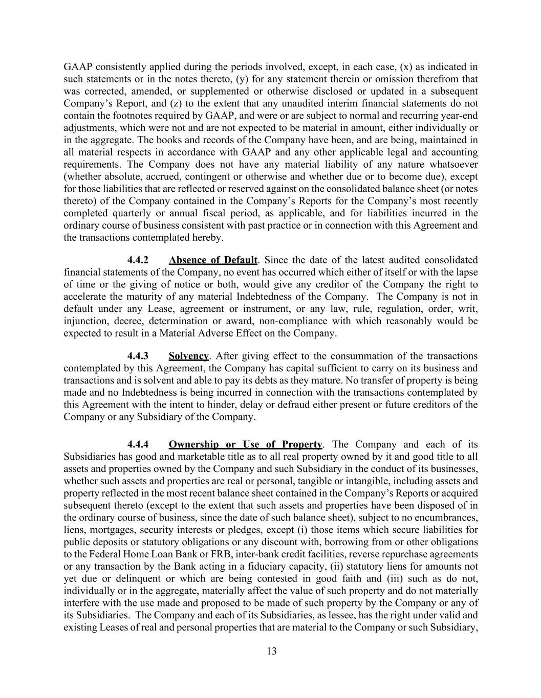 13 GAAP consistently applied during the periods involved, except, in each case, (x) as indicated in such statements or in the notes thereto, (y) for any statement therein or omission therefrom that was corrected, amended, or supplemented or otherwise disclosed or updated in a subsequent Company’s Report, and (z) to the extent that any unaudited interim financial statements do not contain the footnotes required by GAAP, and were or are subject to normal and recurring year-end adjustments, which were not and are not expected to be material in amount, either individually or in the aggregate. The books and records of the Company have been, and are being, maintained in all material respects in accordance with GAAP and any other applicable legal and accounting requirements. The Company does not have any material liability of any nature whatsoever (whether absolute, accrued, contingent or otherwise and whether due or to become due), except for those liabilities that are reflected or reserved against on the consolidated balance sheet (or notes thereto) of the Company contained in the Company’s Reports for the Company’s most recently completed quarterly or annual fiscal period, as applicable, and for liabilities incurred in the ordinary course of business consistent with past practice or in connection with this Agreement and the transactions contemplated hereby. 4.4.2 Absence of Default. Since the date of the latest audited consolidated financial statements of the Company, no event has occurred which either of itself or with the lapse of time or the giving of notice or both, would give any creditor of the Company the right to accelerate the maturity of any material Indebtedness of the Company. The Company is not in default under any Lease, agreement or instrument, or any law, rule, regulation, order, writ, injunction, decree, determination or award, non-compliance with which reasonably would be expected to result in a Material Adverse Effect on the Company. 4.4.3 Solvency. After giving effect to the consummation of the transactions contemplated by this Agreement, the Company has capital sufficient to carry on its business and transactions and is solvent and able to pay its debts as they mature. No transfer of property is being made and no Indebtedness is being incurred in connection with the transactions contemplated by this Agreement with the intent to hinder, delay or defraud either present or future creditors of the Company or any Subsidiary of the Company. 4.4.4 Ownership or Use of Property. The Company and each of its Subsidiaries has good and marketable title as to all real property owned by it and good title to all assets and properties owned by the Company and such Subsidiary in the conduct of its businesses, whether such assets and properties are real or personal, tangible or intangible, including assets and property reflected in the most recent balance sheet contained in the Company’s Reports or acquired subsequent thereto (except to the extent that such assets and properties have been disposed of in the ordinary course of business, since the date of such balance sheet), subject to no encumbrances, liens, mortgages, security interests or pledges, except (i) those items which secure liabilities for public deposits or statutory obligations or any discount with, borrowing from or other obligations to the Federal Home Loan Bank or FRB, inter-bank credit facilities, reverse repurchase agreements or any transaction by the Bank acting in a fiduciary capacity, (ii) statutory liens for amounts not yet due or delinquent or which are being contested in good faith and (iii) such as do not, individually or in the aggregate, materially affect the value of such property and do not materially interfere with the use made and proposed to be made of such property by the Company or any of its Subsidiaries. The Company and each of its Subsidiaries, as lessee, has the right under valid and existing Leases of real and personal properties that are material to the Company or such Subsidiary,