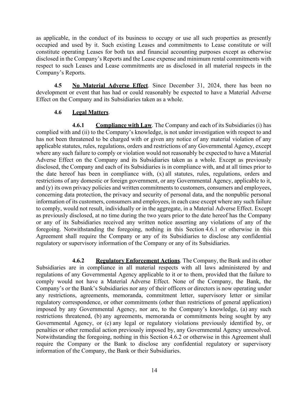 14 as applicable, in the conduct of its business to occupy or use all such properties as presently occupied and used by it. Such existing Leases and commitments to Lease constitute or will constitute operating Leases for both tax and financial accounting purposes except as otherwise disclosed in the Company’s Reports and the Lease expense and minimum rental commitments with respect to such Leases and Lease commitments are as disclosed in all material respects in the Company’s Reports. 4.5 No Material Adverse Effect. Since December 31, 2024, there has been no development or event that has had or could reasonably be expected to have a Material Adverse Effect on the Company and its Subsidiaries taken as a whole. 4.6 Legal Matters. 4.6.1 Compliance with Law. The Company and each of its Subsidiaries (i) has complied with and (ii) to the Company’s knowledge, is not under investigation with respect to and has not been threatened to be charged with or given any notice of any material violation of any applicable statutes, rules, regulations, orders and restrictions of any Governmental Agency, except where any such failure to comply or violation would not reasonably be expected to have a Material Adverse Effect on the Company and its Subsidiaries taken as a whole. Except as previously disclosed, the Company and each of its Subsidiaries is in compliance with, and at all times prior to the date hereof has been in compliance with, (x) all statutes, rules, regulations, orders and restrictions of any domestic or foreign government, or any Governmental Agency, applicable to it, and (y) its own privacy policies and written commitments to customers, consumers and employees, concerning data protection, the privacy and security of personal data, and the nonpublic personal information of its customers, consumers and employees, in each case except where any such failure to comply, would not result, individually or in the aggregate, in a Material Adverse Effect. Except as previously disclosed, at no time during the two years prior to the date hereof has the Company or any of its Subsidiaries received any written notice asserting any violations of any of the foregoing. Notwithstanding the foregoing, nothing in this Section 4.6.1 or otherwise in this Agreement shall require the Company or any of its Subsidiaries to disclose any confidential regulatory or supervisory information of the Company or any of its Subsidiaries. 4.6.2 Regulatory Enforcement Actions. The Company, the Bank and its other Subsidiaries are in compliance in all material respects with all laws administered by and regulations of any Governmental Agency applicable to it or to them, provided that the failure to comply would not have a Material Adverse Effect. None of the Company, the Bank, the Company’s or the Bank’s Subsidiaries nor any of their officers or directors is now operating under any restrictions, agreements, memoranda, commitment letter, supervisory letter or similar regulatory correspondence, or other commitments (other than restrictions of general application) imposed by any Governmental Agency, nor are, to the Company’s knowledge, (a) any such restrictions threatened, (b) any agreements, memoranda or commitments being sought by any Governmental Agency, or (c) any legal or regulatory violations previously identified by, or penalties or other remedial action previously imposed by, any Governmental Agency unresolved. Notwithstanding the foregoing, nothing in this Section 4.6.2 or otherwise in this Agreement shall require the Company or the Bank to disclose any confidential regulatory or supervisory information of the Company, the Bank or their Subsidiaries.