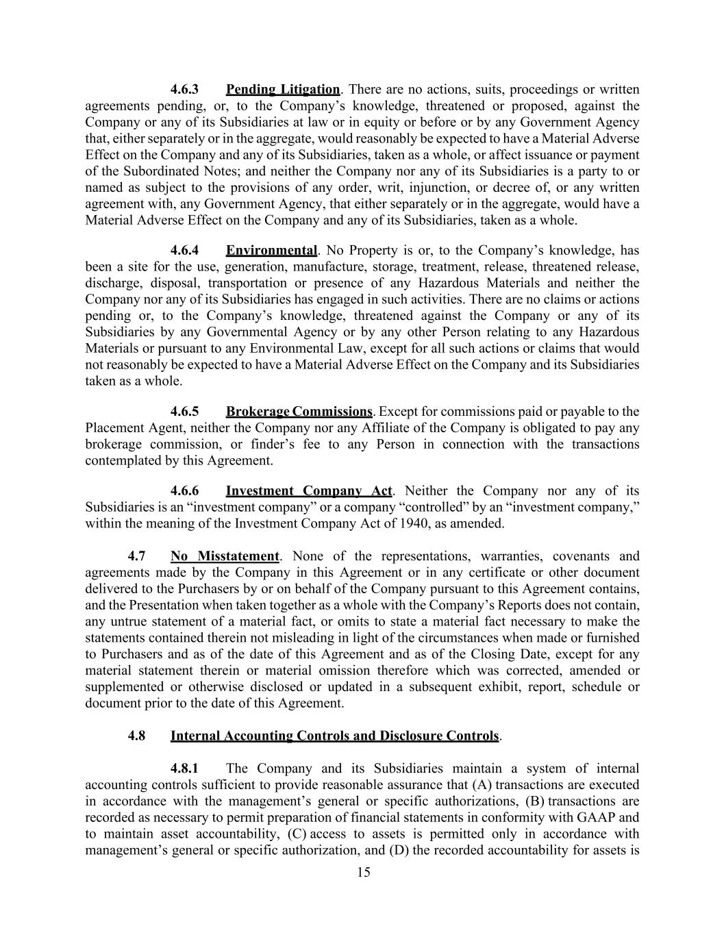 15 4.6.3 Pending Litigation. There are no actions, suits, proceedings or written agreements pending, or, to the Company’s knowledge, threatened or proposed, against the Company or any of its Subsidiaries at law or in equity or before or by any Government Agency that, either separately or in the aggregate, would reasonably be expected to have a Material Adverse Effect on the Company and any of its Subsidiaries, taken as a whole, or affect issuance or payment of the Subordinated Notes; and neither the Company nor any of its Subsidiaries is a party to or named as subject to the provisions of any order, writ, injunction, or decree of, or any written agreement with, any Government Agency, that either separately or in the aggregate, would have a Material Adverse Effect on the Company and any of its Subsidiaries, taken as a whole. 4.6.4 Environmental. No Property is or, to the Company’s knowledge, has been a site for the use, generation, manufacture, storage, treatment, release, threatened release, discharge, disposal, transportation or presence of any Hazardous Materials and neither the Company nor any of its Subsidiaries has engaged in such activities. There are no claims or actions pending or, to the Company’s knowledge, threatened against the Company or any of its Subsidiaries by any Governmental Agency or by any other Person relating to any Hazardous Materials or pursuant to any Environmental Law, except for all such actions or claims that would not reasonably be expected to have a Material Adverse Effect on the Company and its Subsidiaries taken as a whole. 4.6.5 Brokerage Commissions. Except for commissions paid or payable to the Placement Agent, neither the Company nor any Affiliate of the Company is obligated to pay any brokerage commission, or finder’s fee to any Person in connection with the transactions contemplated by this Agreement. 4.6.6 Investment Company Act. Neither the Company nor any of its Subsidiaries is an “investment company” or a company “controlled” by an “investment company,” within the meaning of the Investment Company Act of 1940, as amended. 4.7 No Misstatement. None of the representations, warranties, covenants and agreements made by the Company in this Agreement or in any certificate or other document delivered to the Purchasers by or on behalf of the Company pursuant to this Agreement contains, and the Presentation when taken together as a whole with the Company’s Reports does not contain, any untrue statement of a material fact, or omits to state a material fact necessary to make the statements contained therein not misleading in light of the circumstances when made or furnished to Purchasers and as of the date of this Agreement and as of the Closing Date, except for any material statement therein or material omission therefore which was corrected, amended or supplemented or otherwise disclosed or updated in a subsequent exhibit, report, schedule or document prior to the date of this Agreement. 4.8 Internal Accounting Controls and Disclosure Controls. 4.8.1 The Company and its Subsidiaries maintain a system of internal accounting controls sufficient to provide reasonable assurance that (A) transactions are executed in accordance with the management’s general or specific authorizations, (B) transactions are recorded as necessary to permit preparation of financial statements in conformity with GAAP and to maintain asset accountability, (C) access to assets is permitted only in accordance with management’s general or specific authorization, and (D) the recorded accountability for assets is